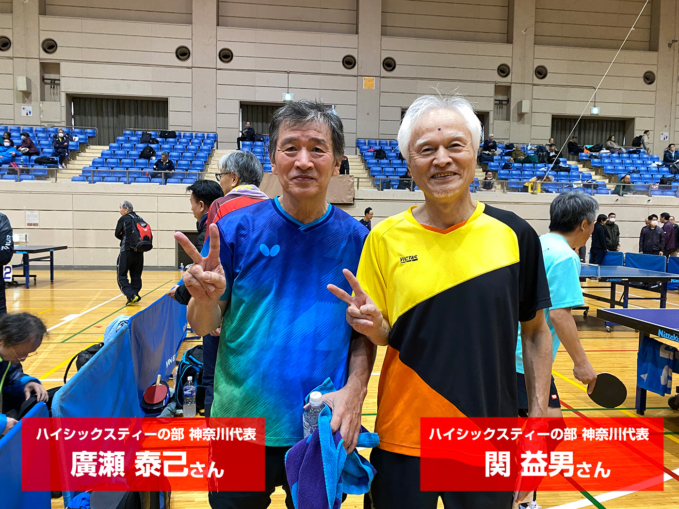 今回、試合観戦に出向いた令和7年度東京選手権大会の神奈川県予選大会の会場にて、知り合いの方々が厳しい試合を勝ち残り、代表権をゲットしていましたが、関益男さんという方もハイシックスティーの部にで見事勝ち残りました。(写真右の白髪の方です)