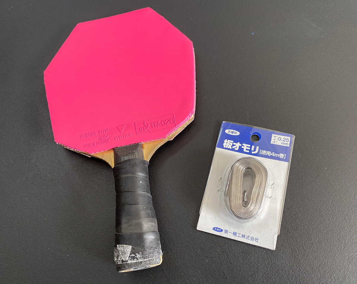 卓球メーカーから販売されているバランサーでもいいのですが、かなりの重さが欲しかったのでDIYショップにて板オモリを購入し、グリップテープの下に巻き付けてみました。