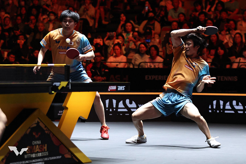 男子ダブルスは松島輝空/戸上隼輔(木下グループ/井村屋グループ)が周啓豪/陳俊菘(中国)と対戦。異なる球質の相手ペアに好ラリーを繰り広げたが、1-3で惜敗。一方、女子ダブルスでは、早田ひな/朱芊曦(日本生命/韓国)が王暁彤/徐奕(中国)をフルゲームの接戦で下し、決勝進出を果たした。早田は「言葉の壁はあるが、気持ちが通じ合った時は特別にうれしい」と語り、朱も「試合を重ねてリズムが合ってきた。決勝では120%の力を出したい」と意気込みを語った。