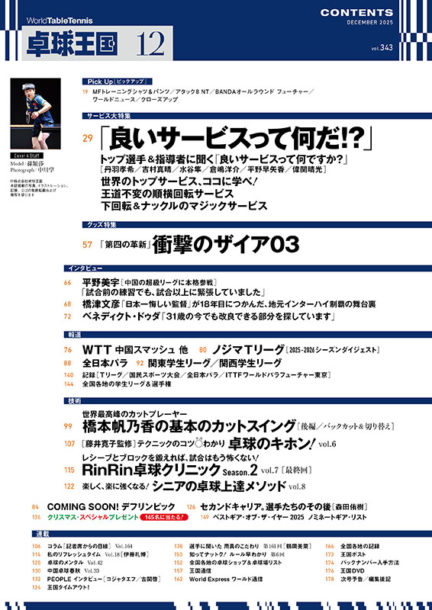 表紙に登場するのは孫穎莎(中国)。サービスのトスを上げている写真が使われているのは、巻頭特集が「良いサービスって何だ!?」というサービスの大特集を組んだためだ。サービスの特集を5つのテーマに分けて多角的視点で紹介する。