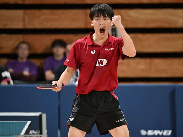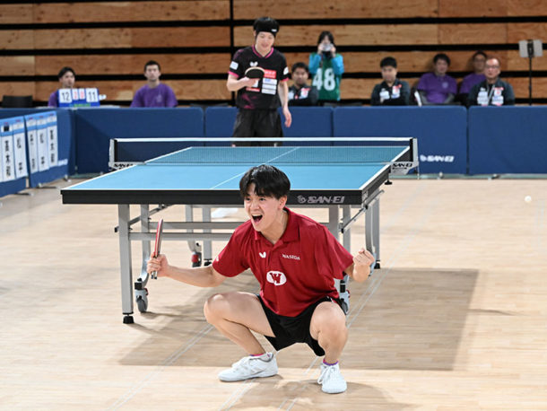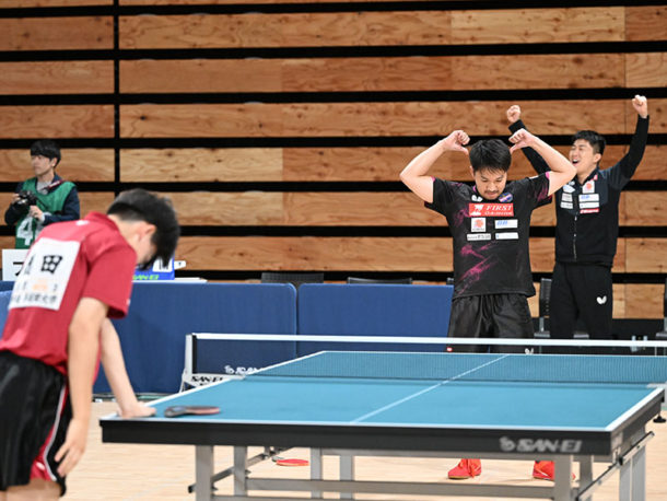 トップで濵田一輝が高木和との競り合いの中で強気でロングサービスを使って先取点をあげると、2番の徳田は松平の鉄壁のブロックを目の覚めるような両ハンドドライブでぶち抜いた。あとがなくなったファーストだったが、丹羽は動揺を見せずに濵田尚人のリズムを崩すために緩急をつけたプレーでストレート勝ちし、後半につないだ。