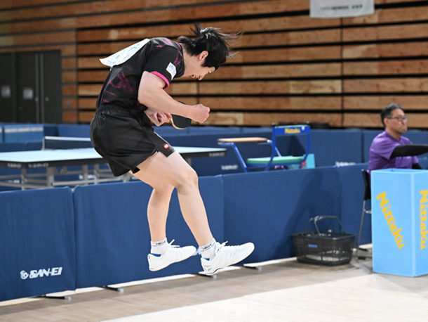 隣のコートでは高木和と徳田の試合が平行して行われていたが、高木和は苦しんでいた松平を鼓舞するかのように1得点目から大きな声を出して拳を固める。「トップの濵田戦途中で左足を痛めた」という高木和だったが、パワフルなフォアドライブで徳田を攻め続けて圧倒。