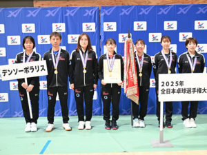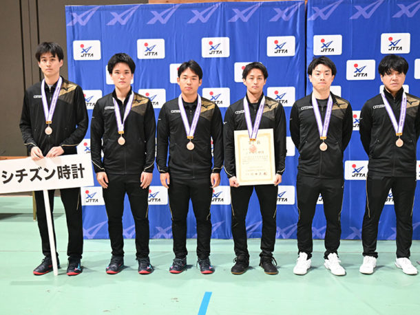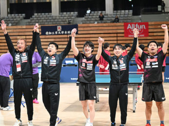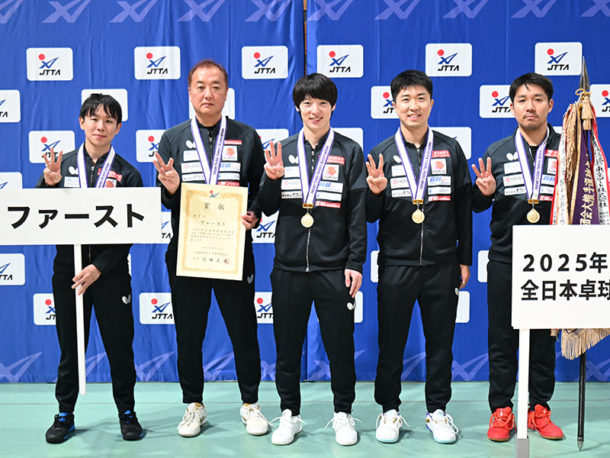 ファーストは準決勝のシチズン時計で、日本卓球協会からの国内大会への資格停止処分がこの日に明けた丹羽孝希を3番に起用。2-0リードでまわってきた丹羽は、青森山田中・高の後輩にあたる三部航平を3-1で破り、復帰戦勝利とともにチームの決勝進出を決めた。