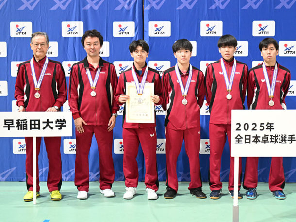 全日本選手権(団体の部)の最終日が青森市のカクヒログループ スーパーアリーナで行われ、男子はファーストが決勝で早稲田大を逆転で下して3連覇を達成した。
