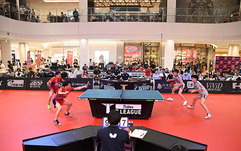 パルコシティで開催され、来館者も足を止めて観戦した。1番ダブルスは、琉球の大島(左奥)・三木(左手前)ペアが勝利