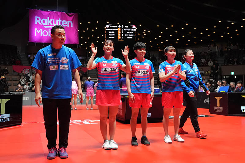 張本美和、長﨑美柚、ジュ ユリン(朱雨玲)、チェン イーチン(鄭怡静)という豪華メンバーでホームゲームを戦った木下アビエル神奈川は、九州カリーナ、日本生命レッドエルフに勝利。特に19日の日本生命戦には1300名以上の観客が来場する中、2-1で迎えた4番では、KA神奈川の張本美和が日本生命・赤江夏星を最終ゲーム12-10で退けチームの勝利を決めた。このホーム2戦での勝利で勝点7を獲得したKA神奈川は、勝点で日本生命を抜き、女子チーム順位の1位に立った。