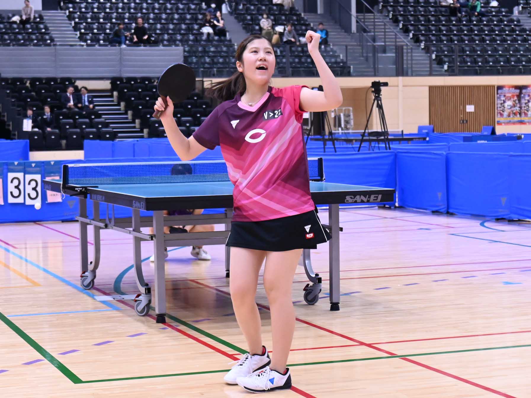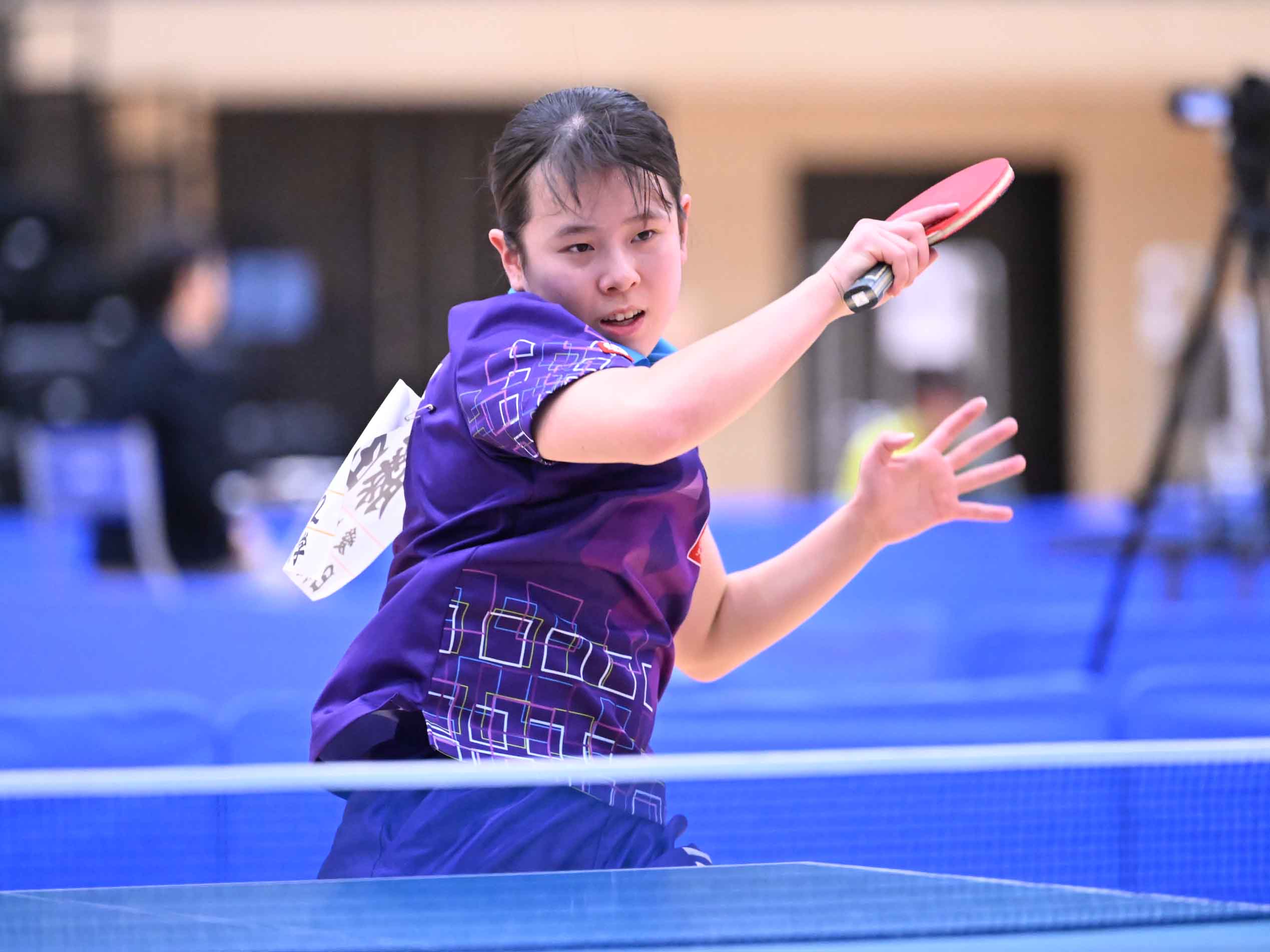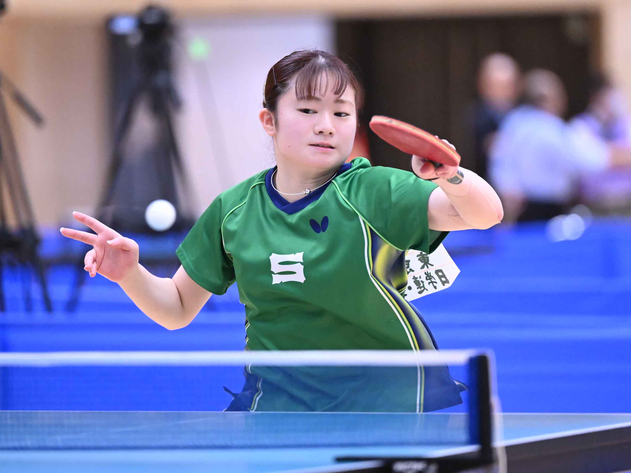 女子シングルス準決勝はいずれも愛知工業大と中央大の対戦となり、面田と兼吉が決勝へ進出。四天王寺の先輩・後輩対決となり、面田がパワフルなドライブで兼吉のカットを打ち抜き、ゲームカウント3-1とリード。面田は5ゲーム目も8-4とリードを奪って試合を進めていたが、勝ちを意識したか次第に強打のミスが目立ち始め、兼吉の攻撃も決まり出してこのゲームを逆転で落とす。