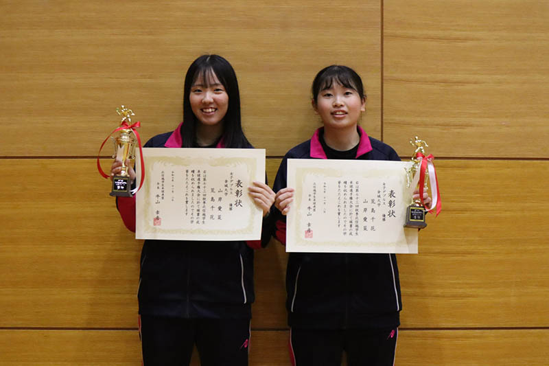 女子ダブルスは山岸/荒島ペアが初優勝。山岸は団体とシングルスを合わせ、1年生にして三冠に輝いた。