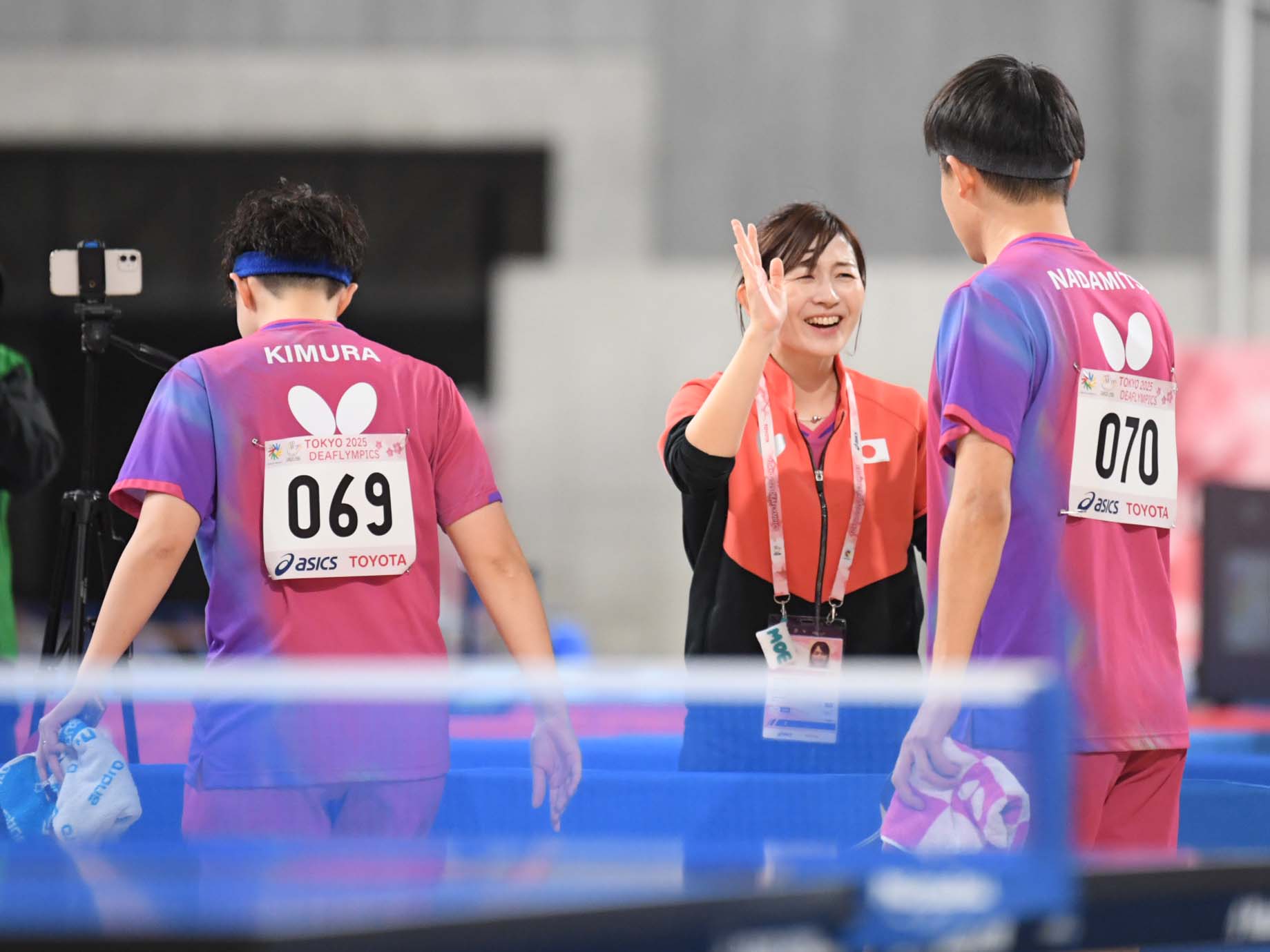 灘光/木村のベンチに入ったのは、2013年大会女子シングルス金メダリストの南方萌(旧姓:上田)コーチ。打ちミスが続いた4ゲーム目にはタイムアウトで2人を落ち着かせ、きっちり4-0での勝利につなげた。南方コーチにとっても選手時代以来、12年ぶりのデフリンピックでの勝利だ。