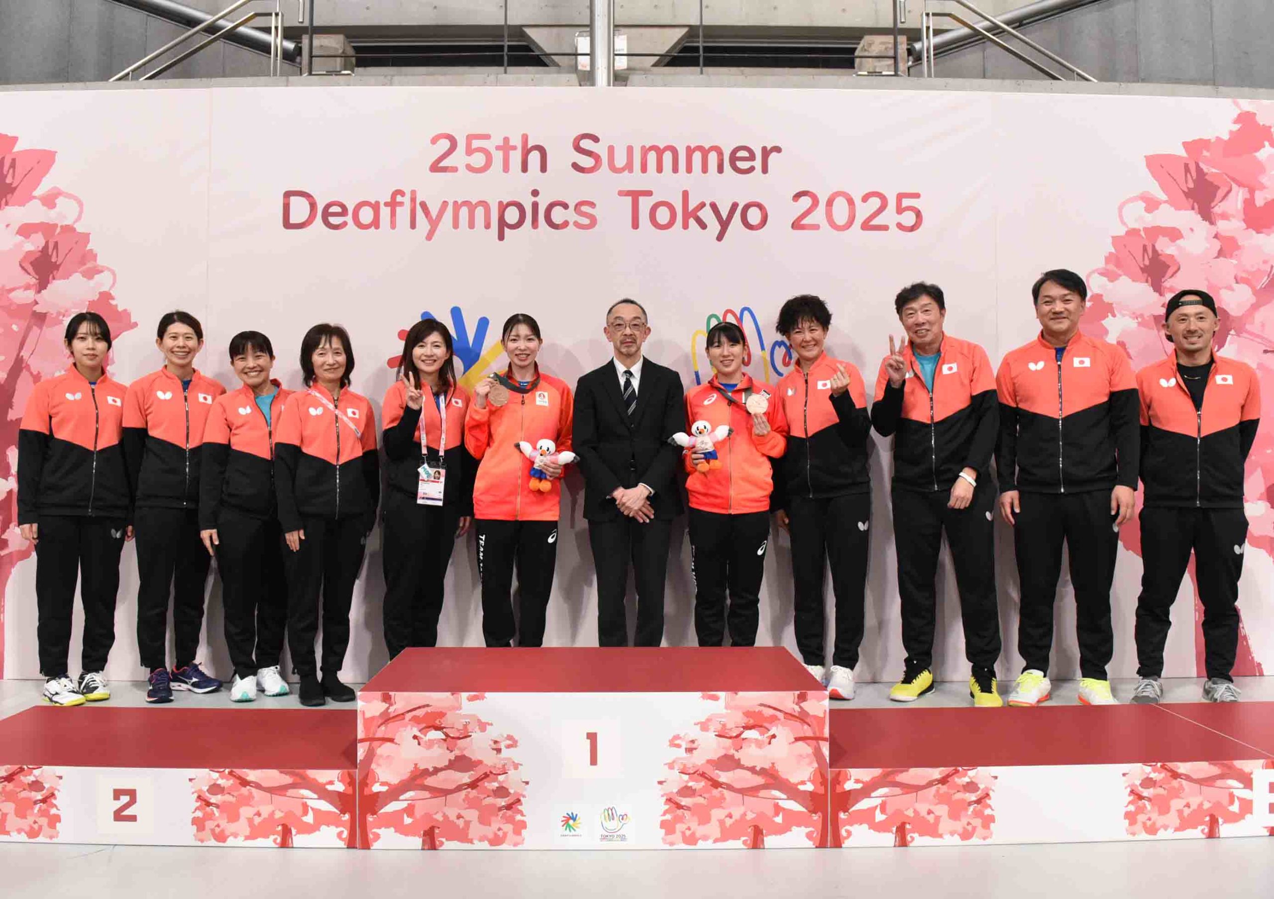 日本代表スタッフと。中央は表彰式でプレゼンターを務めた日本ろうあ者卓球協会・旅川正人会長