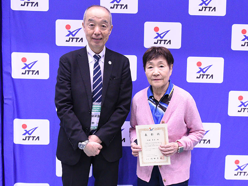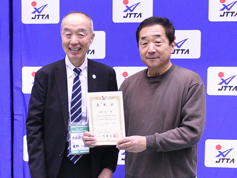 全日本マスターズ通算20回優勝の表彰を受けた坂本憲一選手(右/COLOR・神奈川)。左はプレゼンターの日本卓球協会副会長の星野一朗氏
