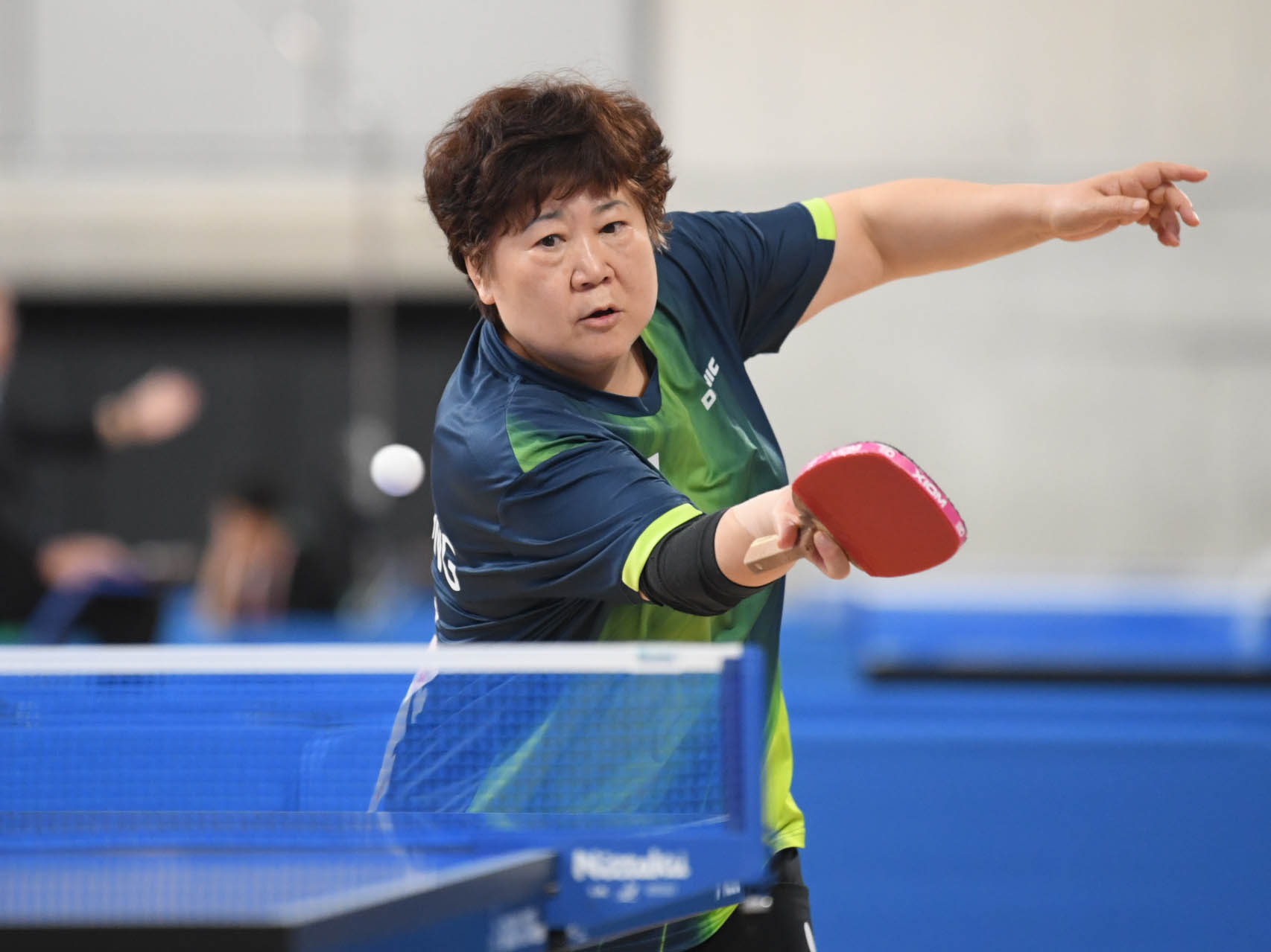 17歳の山田萌と対戦した61歳のハ・ミヨンは片面のみで打球する日本式ペンホルダー