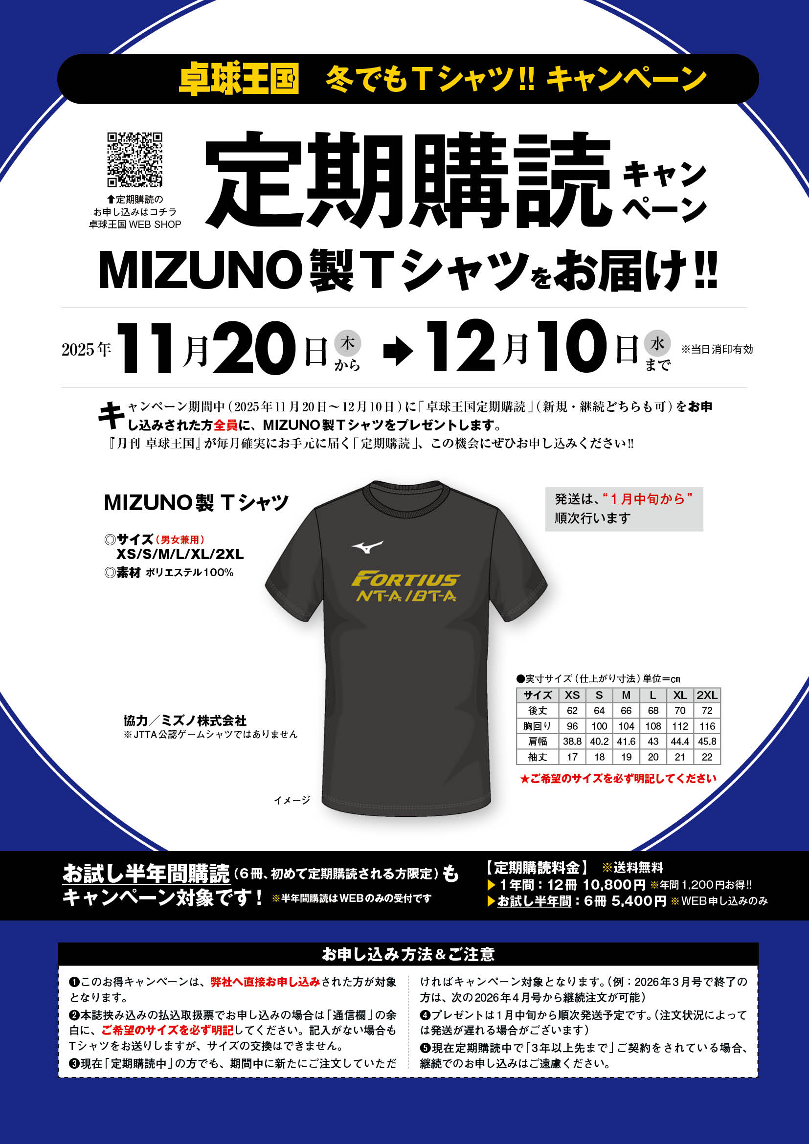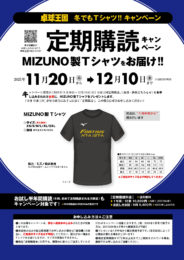 ただいまお得な【定期購読キャンペーン】を期間限定で開催中!キャンペーン期間中(11/20~12/10)に定期購読(新規、継続)をお申し込みいただいた方全員にミズノ製のTシャツをプレゼントいたします。 皆さまのご注文、お待ちしております!