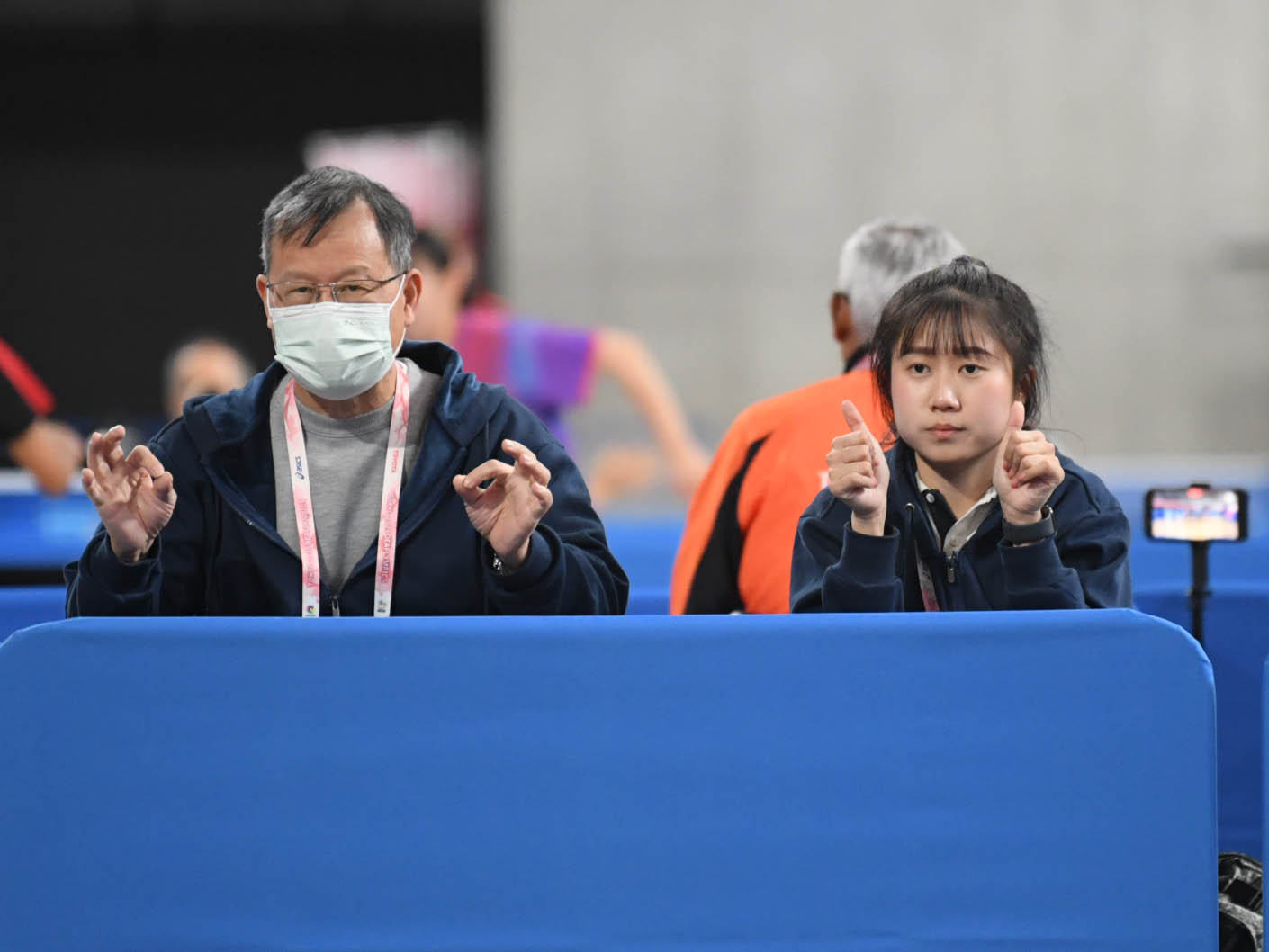 右は香港の手話通訳。1球ごとにジェスチャーで選手にエール