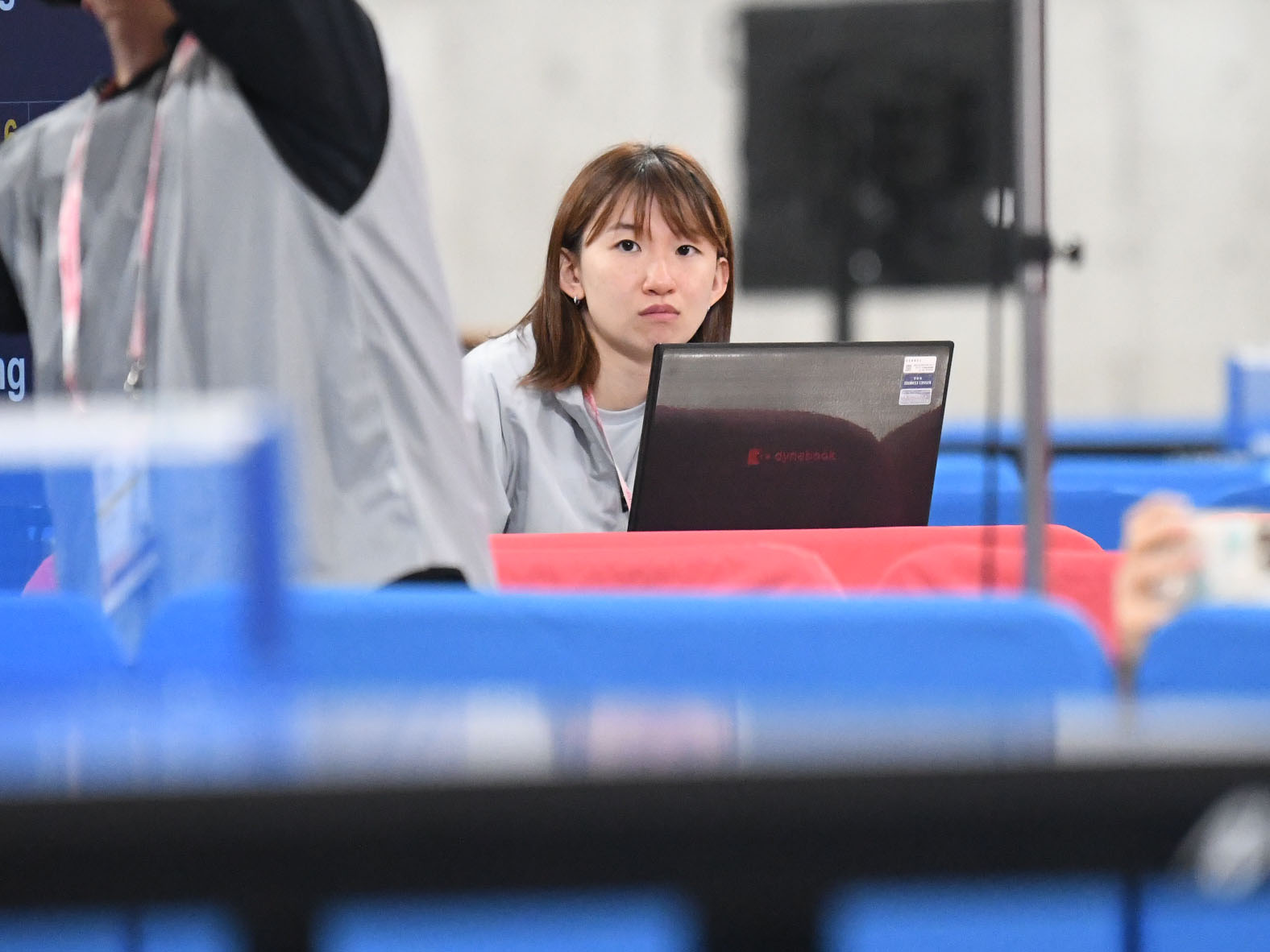 こちらは山田萌心選手の姉で早稲田大の彩心選手。妹が戦う隣のコートでスコア表示の補助をしていました