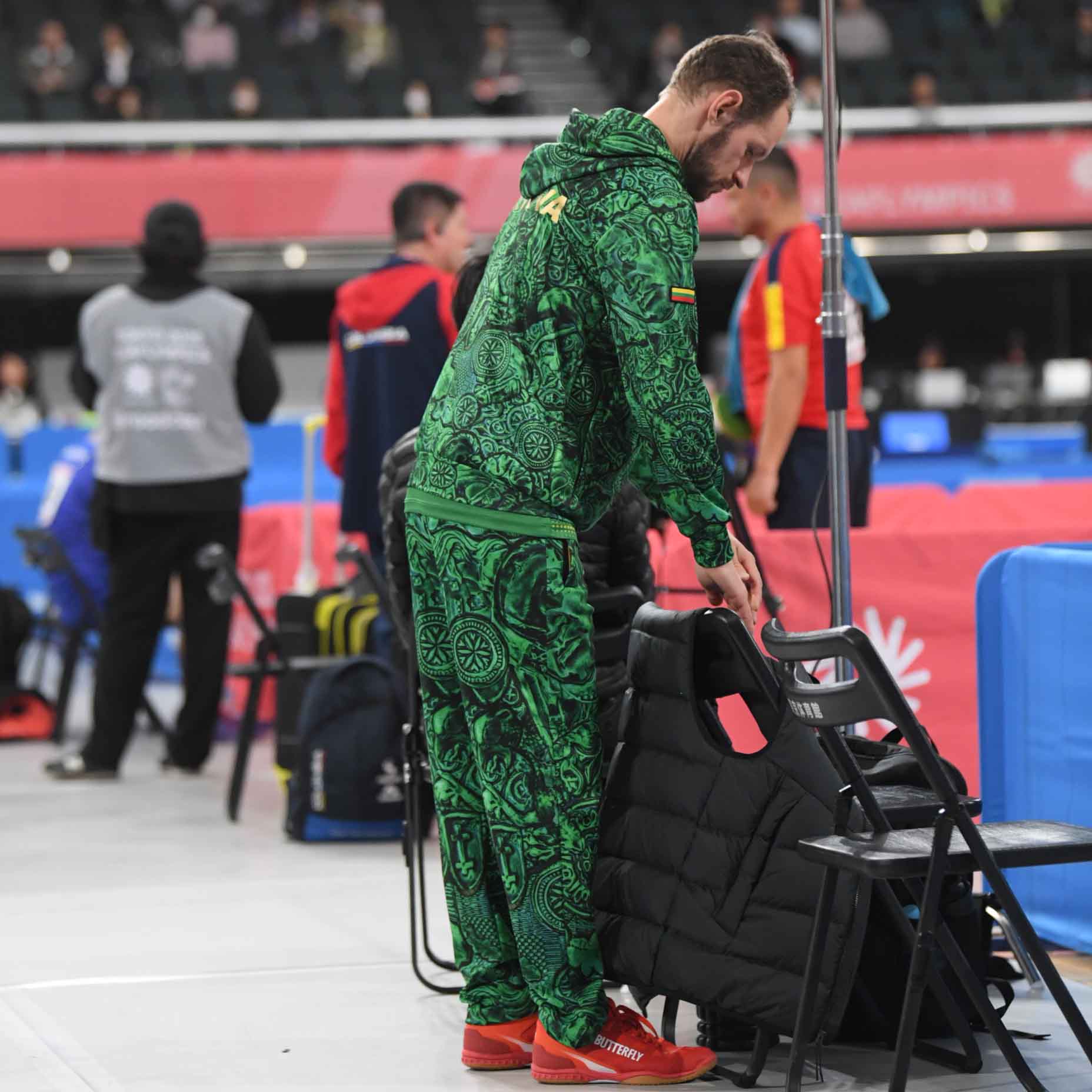 上下グリーンで目立っていたラトビア代表のウォーミングアップウェア。よーく見ると顔が描かれていたり、なんとも不思議な柄。