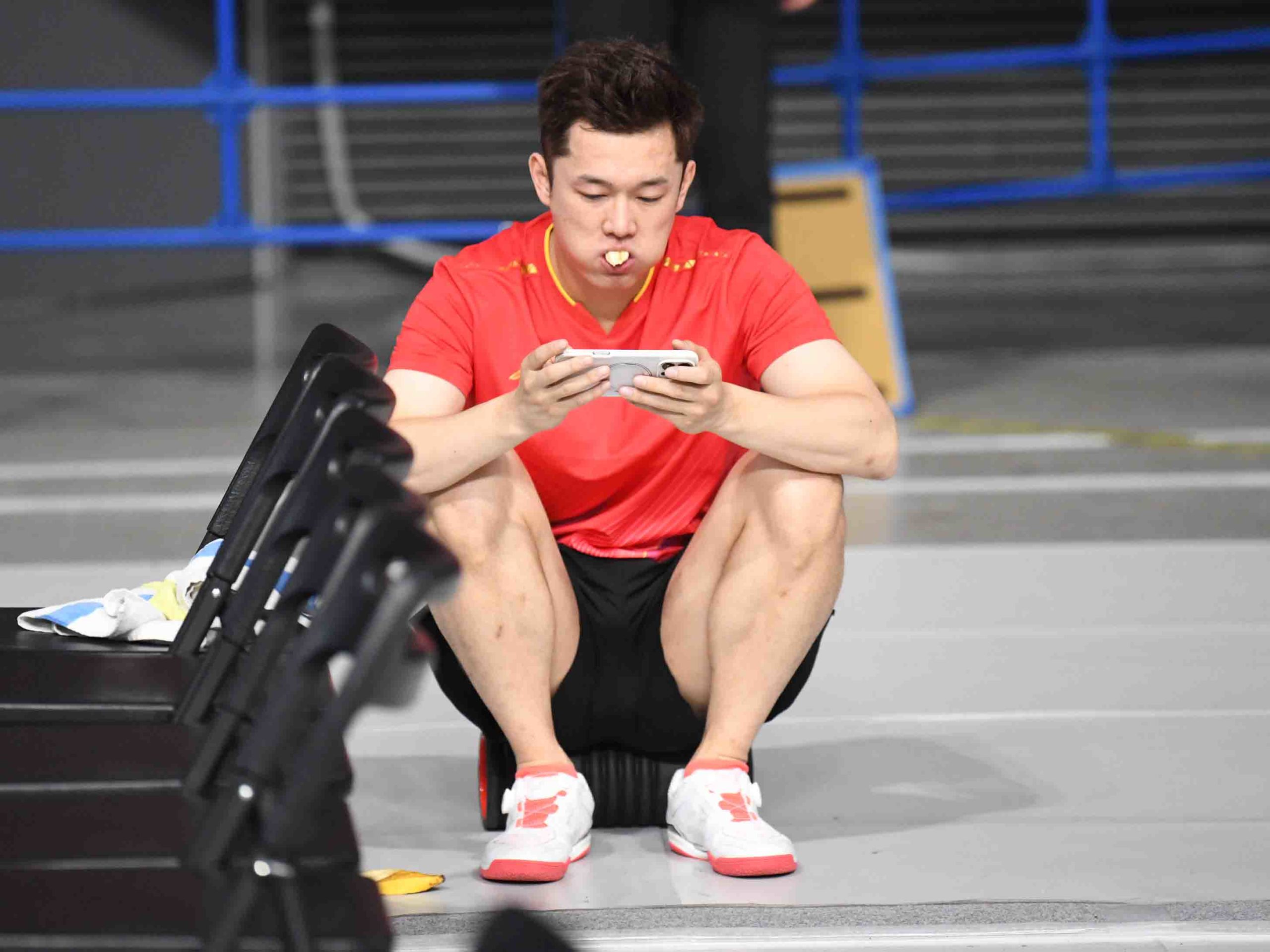 試合間や試合中によくバナナを食べている中国男子のエース、ワン・コン。バナナを食べながら対戦相手の映像でも見ているのかと思ったら、ゲームしてました。