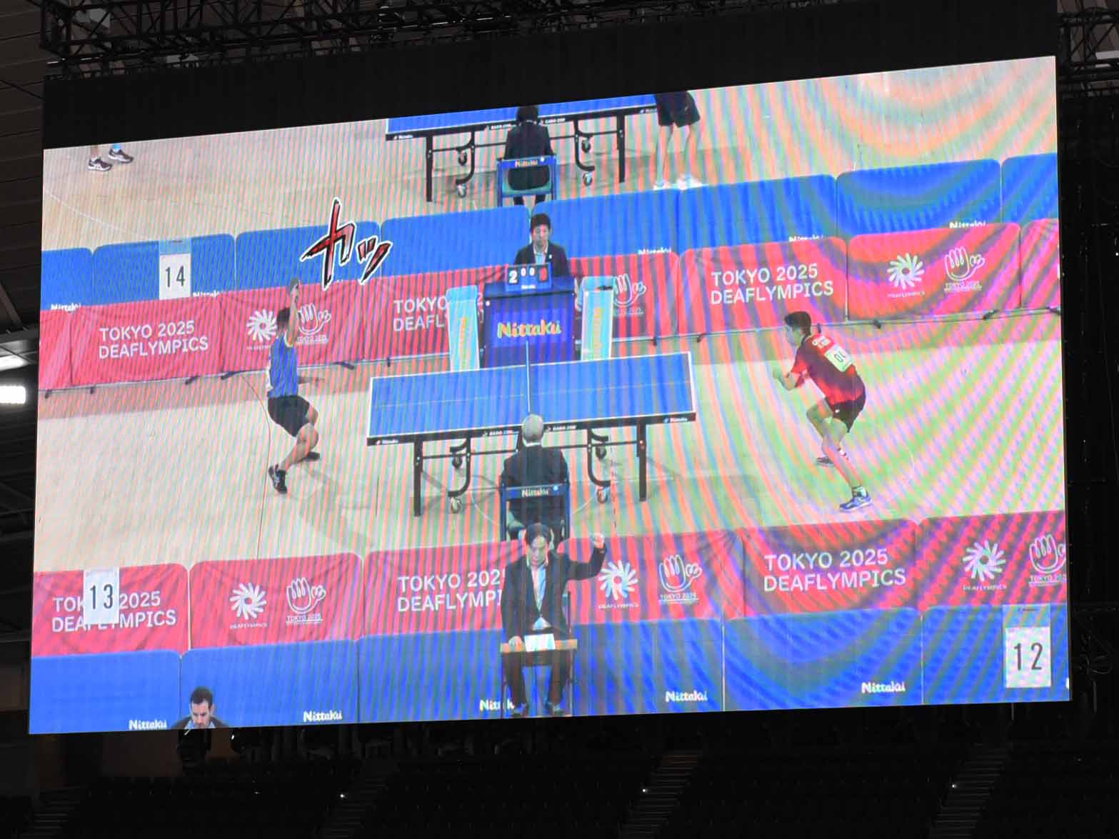 毎年、全日本選手権が開催され、東京2020オリンピック・パラリンピック卓球競技の舞台にもなるなど、日本卓球界におけるセンターコートとも言える東京体育館。今回のデフリンピック卓球競技も東京体育館で試合が行われているが、レイアウトの特徴はコート上に吊るされた大型ビジョン。聴こえない人、聴こえにくい人にもわかりやすいよう、さまざまなインフォーメーションをテキストで表示している。また、センターコートで行われている試合の映像を映す際には、コートでの打球音や会場内の音を拾って瞬時に画面上にテキストやイラストで表示する試みもなされている。
