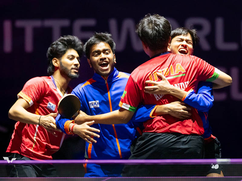 準々決勝で中国を破ったチャイニーズタイペイに競り勝ち、喜びを爆発させたU19男子インドチーム