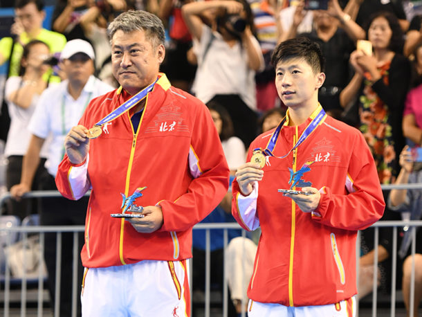 2017年の全中国運動会で2連覇を達成した馬龍。左は北京男子チームの張雷監督(当時)