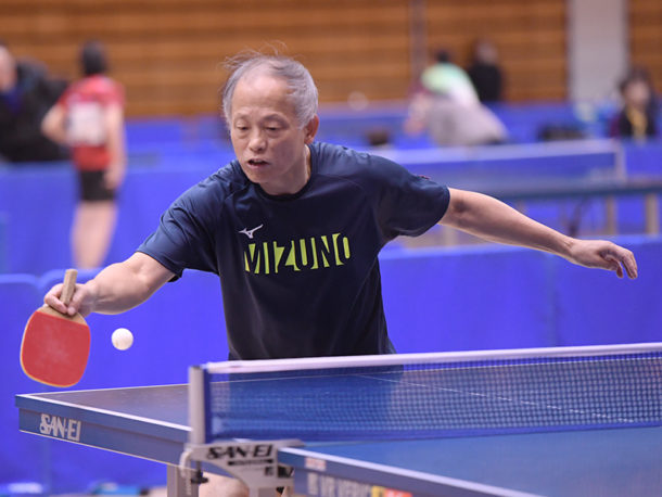 今からちょうど10年前、2015年の全日本選手権マスターズの部、男子ローシックスティで優勝を飾った小松繁(現・城東クラブ)。今年11月22〜24日に行われた全日本選手権マスターズの部でも、ローセブンティで3位に入った実力者で、関西のマスターズ卓球界では知られた顔。堂々たる体躯から粘り強くフォアドライブを連打し、得点を重ねる。