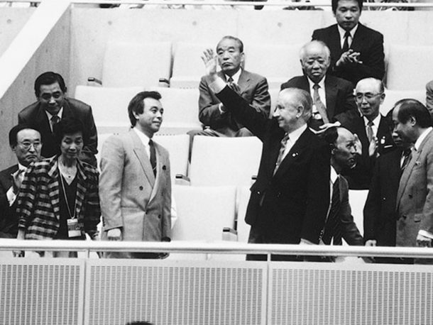 1991年世界選手権千葉大会で、VIP席にIOCのサマランチ会長(当時)を迎える