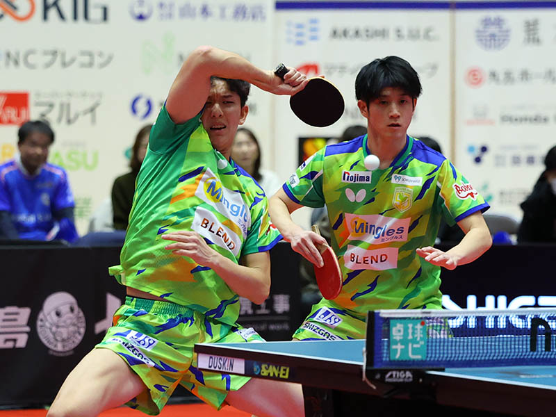1番のダブルス、静岡・五十嵐史弥(左)/松下大星は第3ゲームを8-10から逆転勝利しチームを波に乗せた