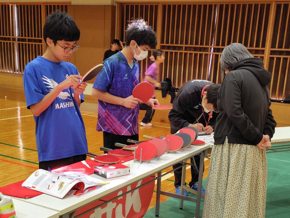 1日目の個人戦は1~3回戦が5ゲームズマッチ、4回戦~準々決勝が3ゲームズマッチ、準決勝・決勝は1ゲームマッチという独特のルールで試合を実施。また、会場にはニッタクの試打コーナーや商品販売ブースを設け、試合で負けてしまった選手もイベントを楽しめるようにした。試打コーナーでは鄭慧萍さんやニッタクスタッフとも気軽にコミュニケーションを取ることができ、選手だけでなく指導者や保護者も楽しんでいる光景が見られた。また、決勝終了後にはニッタク商品をかけたジャンケン大会、鄭慧萍さんのミニ講習会も実施し、最後まで会場に残ってイベントを楽しめる工夫を凝らした。