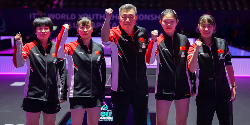 2025年世界ユースで、U19女子団体優勝の中国。中央が李鷺コーチ