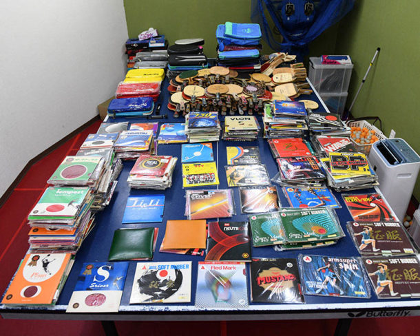 別冊グッズ2022に登場時の真中さん。お宝級のラバーらラケットがびっしりと並ぶ