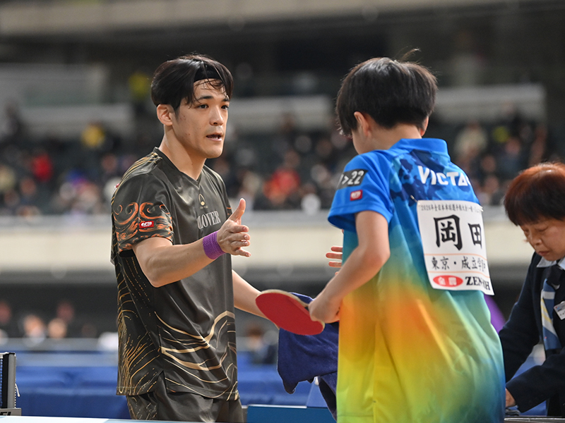 「もともとカット打ちは得意なほう」という江藤。32歳の江藤に対し、13歳の岡田。年齢差もあり、江藤がパワーで一気に押し切るかと思われたが、岡田はバックカットの驚異的な粘りを見せ、しぶとく江藤の打ちミスを誘った。「相手のバックカットの質が1本1本高かった。打ち抜けるかなと思っていたけど、カットの変化があって、守備力が高かったですね」(江藤)。4ゲーム目をジュースで制した岡田が、3ー1でシングルス初戦を突破した。