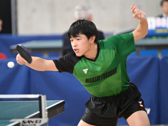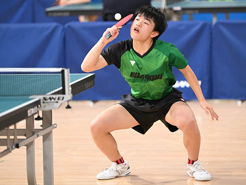 バック面でのプッシュレシーブや、しゃがみ込みサービス、両ハンドのミート打ちなどを駆使し、さまざまな技で相手を翻弄しながら戦った松尾孝太郎(東福岡高)。ジュニア男子1回戦で、亀川梗平(関西高)に惜しくも1-3で敗れたが、その独創的なプレースタイルは、ひときわ目を引いた。