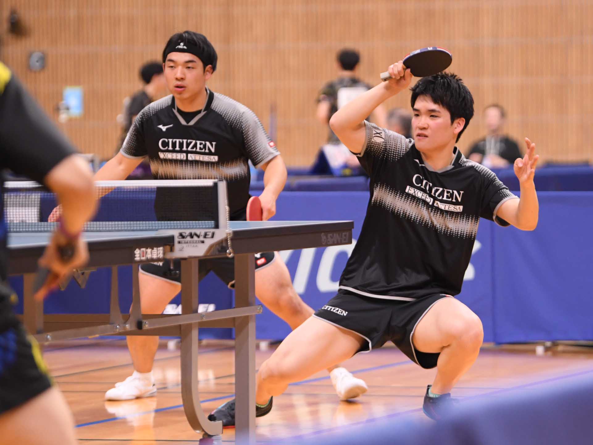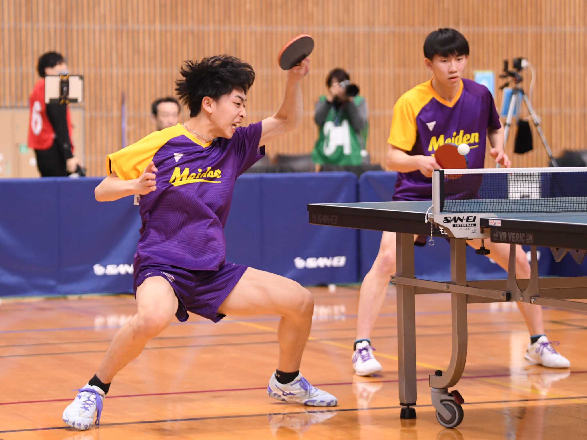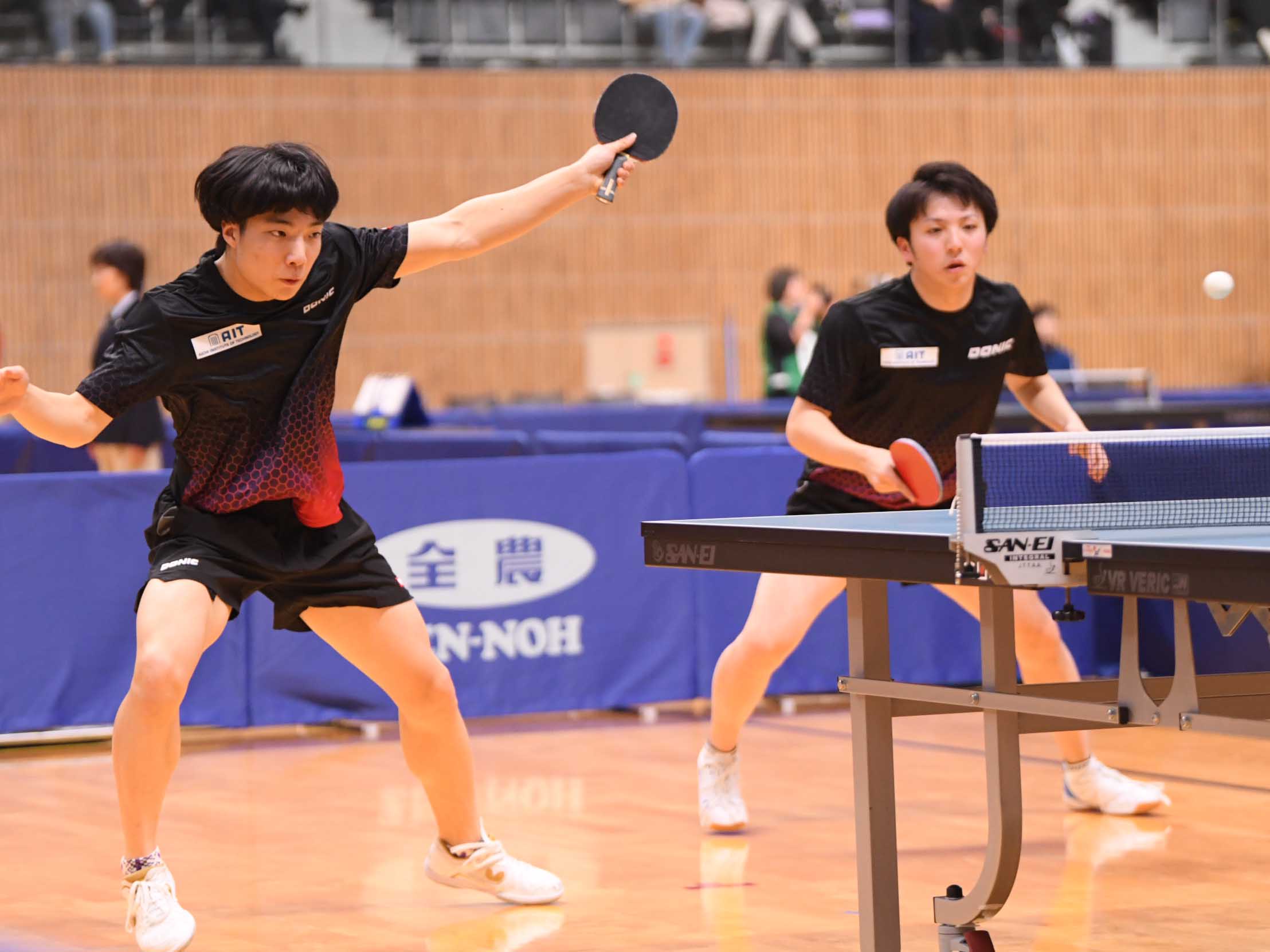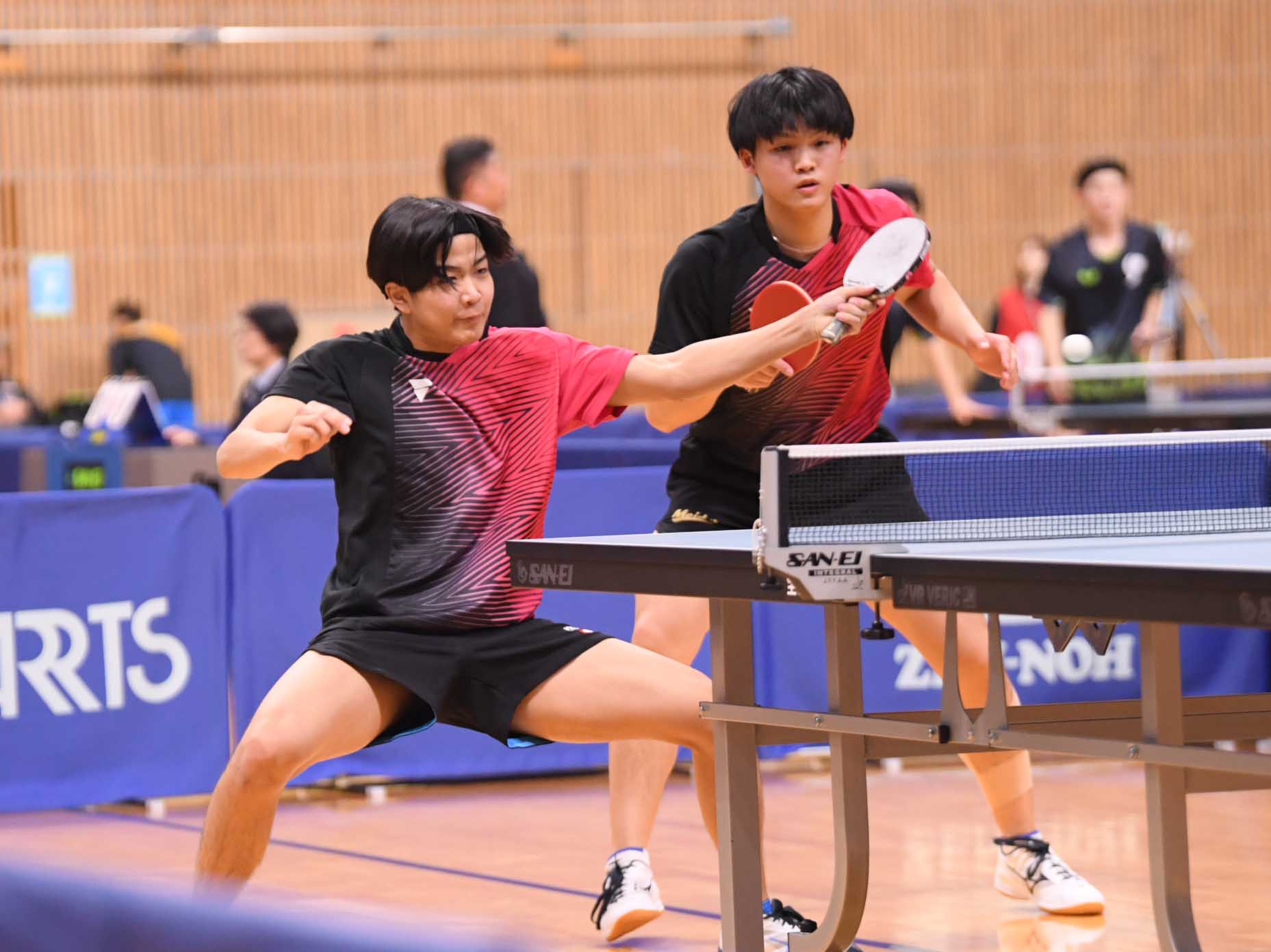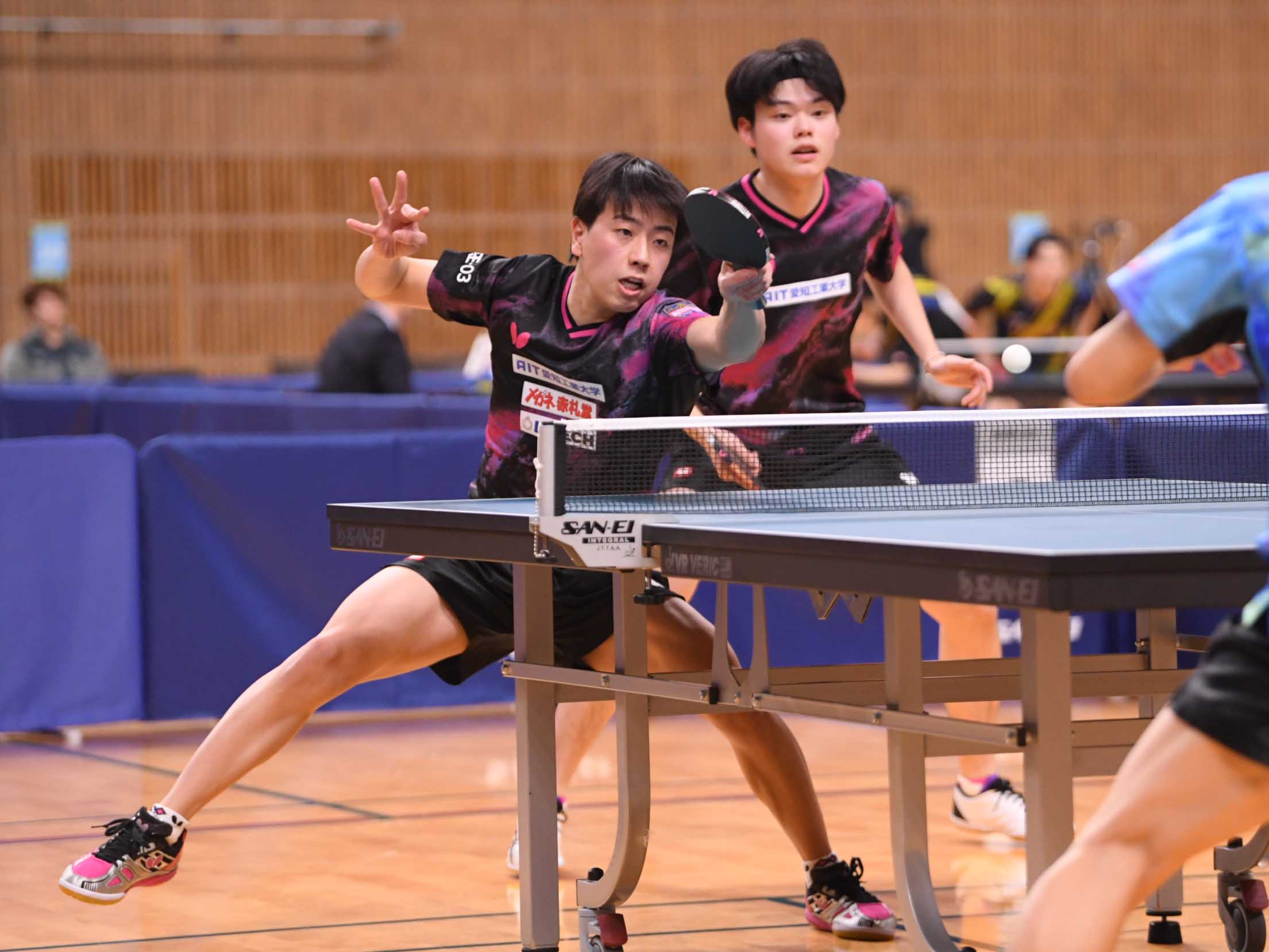 愛知開催の今大会、愛工大名電高と愛知工業大からは4ペアが準々決勝進出。昨週の男子シングルス2位の篠塚と同3位の谷垣のペアは初戦の4回戦で田原彰悟/酒井明日翔(協和キリン/T.O.M&卓球三昧)にゲームカウント0-2から逆転勝利。昨日の1回戦で及川瑞基/坪井勇磨(岡山リベッツ/クローバー歯科カスピッズ)を3-2で破った坂井/面田は、今日の4回戦でも全日学優勝の濵田一輝/徳田幹太(早稲田大)を下した。