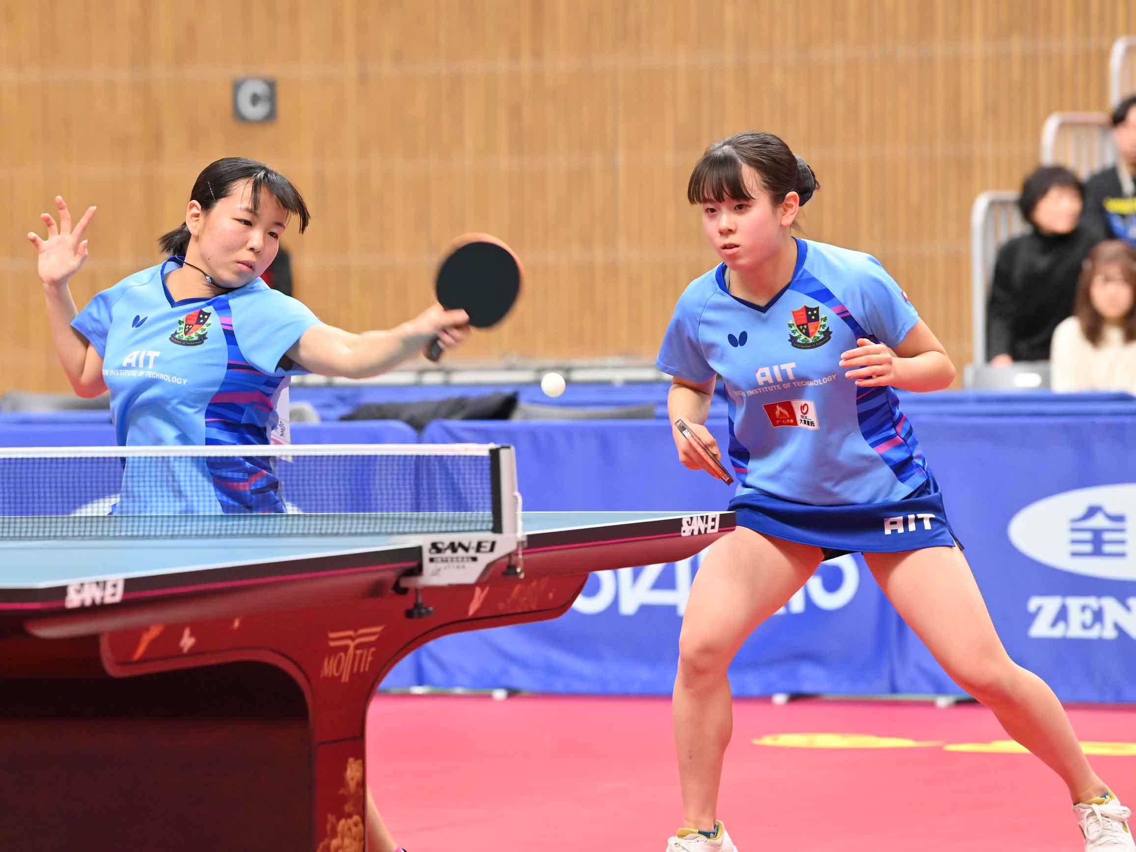 2連覇を狙う笹尾/麻生は全日学優勝ペアの藤田/伊藤をストレートで下して準決勝進出。1・2ゲーム目は競り合ったが、勝負どころでは得点を許さず。台から出たボールを見逃さずに先手を奪い、ラリーでも高い連係を見せて3ゲーム目は一気に押し切った。