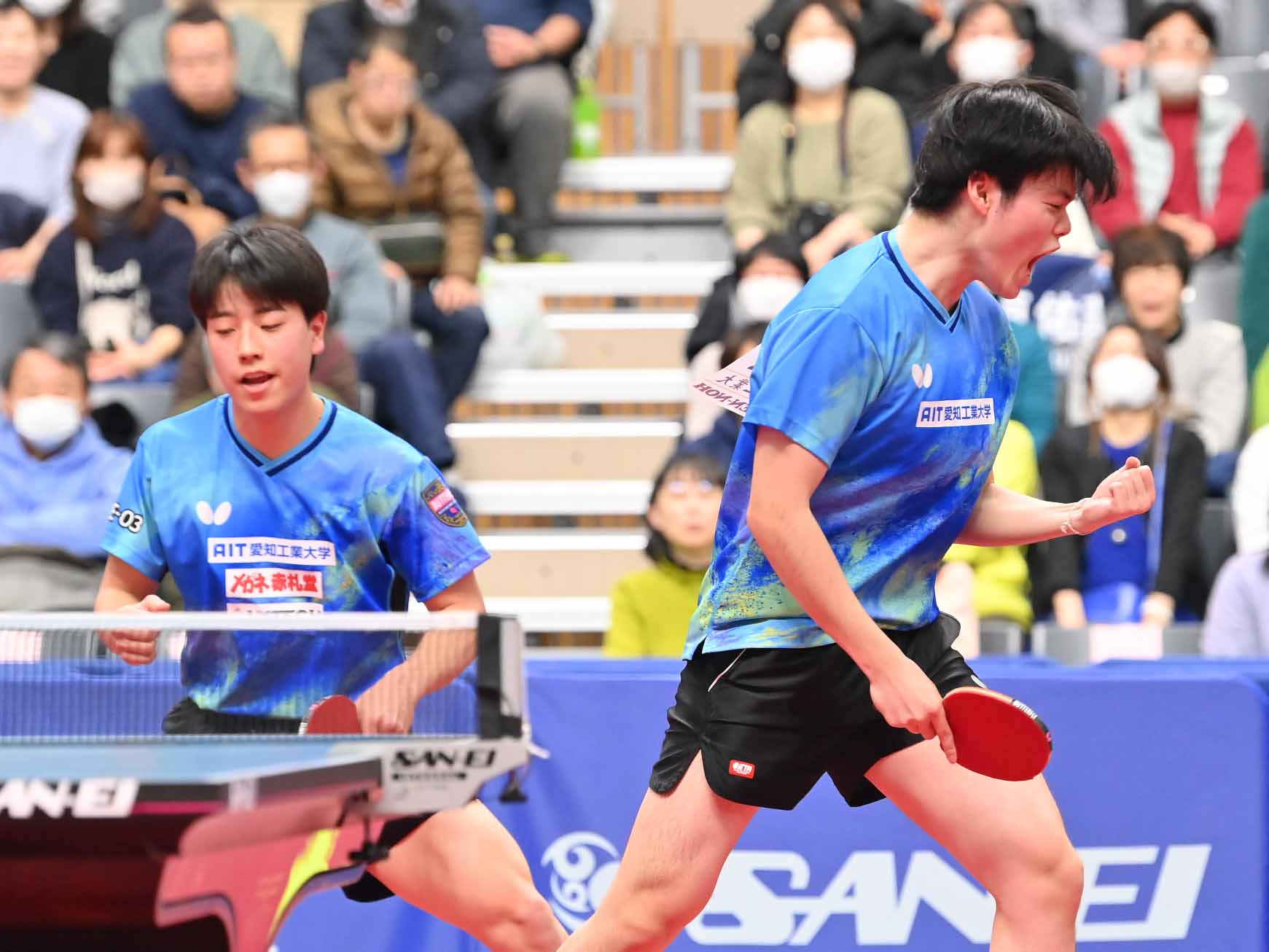 男子ダブルス準決勝は2試合ともフルゲームで決着。篠塚/谷垣と坂井/面田の愛工大名電先輩・後輩対決は篠塚/谷垣に軍配。激しいラリーが繰り広げられたが、篠塚/谷垣がゲームカウント2-1とリードし、4ゲーム目には10-8でマッチポイント。しかし、ここから4本連取を許して最終ゲームに持ち込まれると、5ゲーム目も1-3と出足で失点。しかし、気合を入れ直したか、ここから篠塚/谷垣が7本連取で逆転して先輩の意地を見せた。