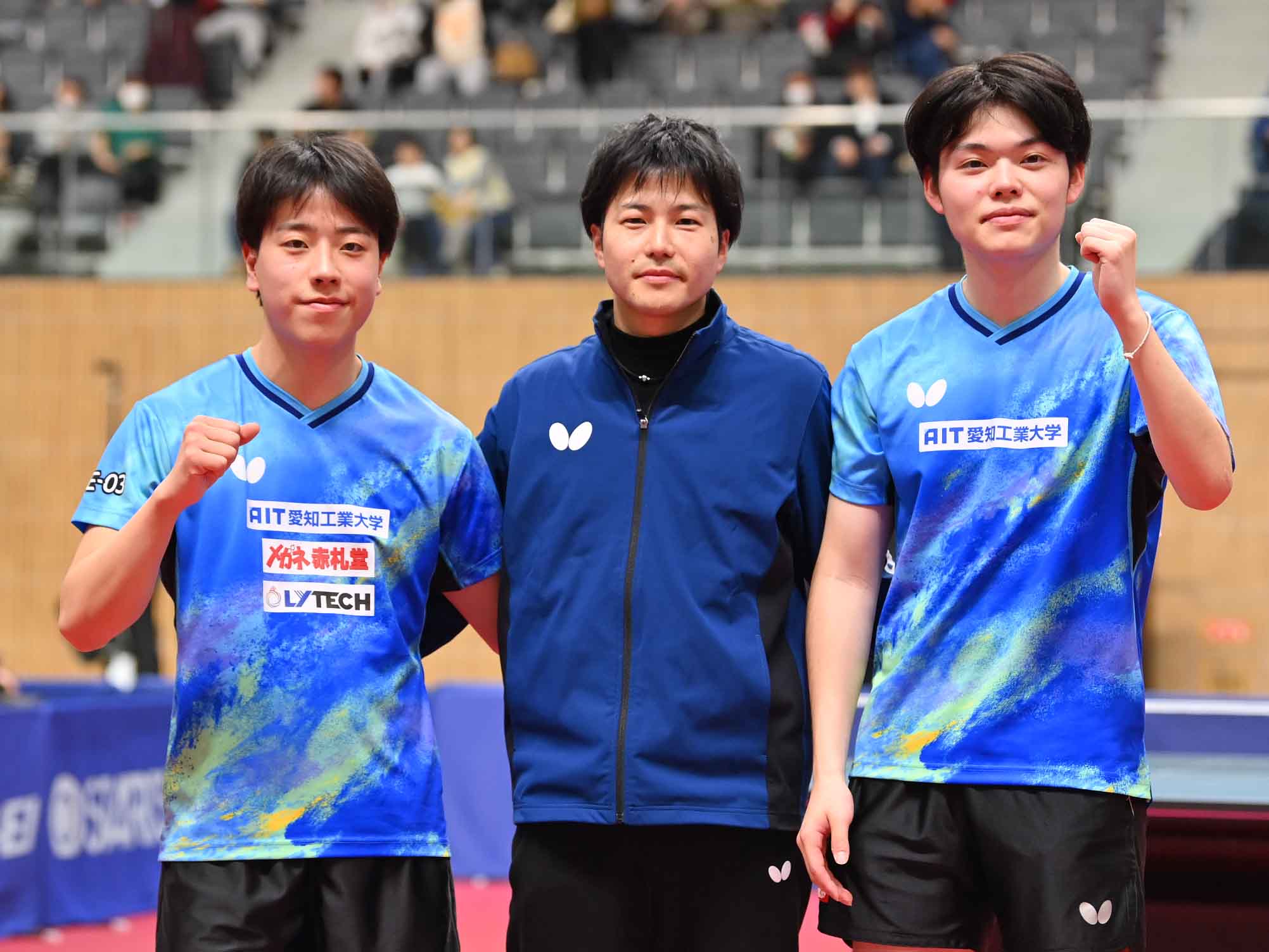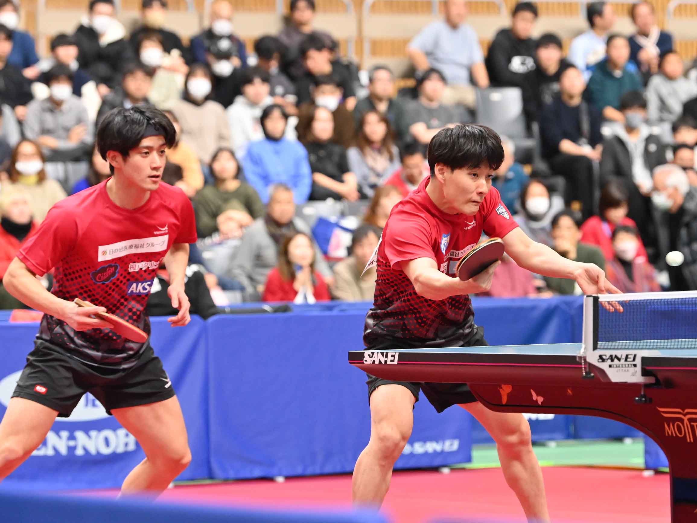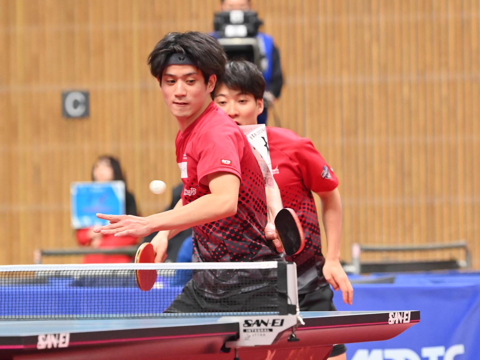 篠塚/谷垣は今大会の初戦で田原彰悟/酒井明日翔(協和キリン/T.O.M&卓球三昧)にゲームカウント0-2から逆転勝利。準々決勝、決勝では愛工大名電の後輩ペアにフルゲームで勝利と、接戦をくぐり抜けて決勝に進んだが、最後に会心のプレーで優勝を決めた。