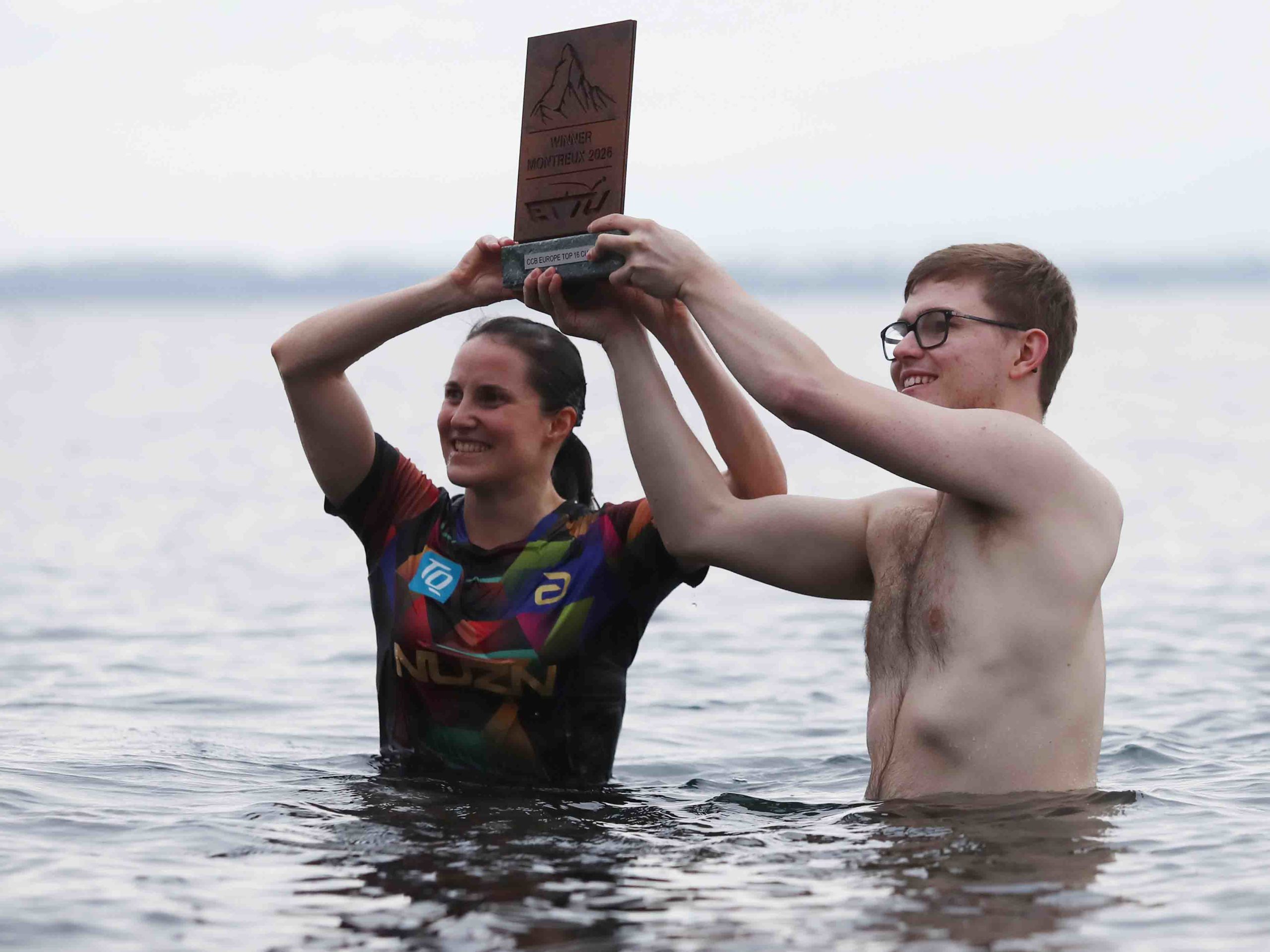 試合後は寒空の下、冬のレマン湖に飛び込んだチャンピオン2人