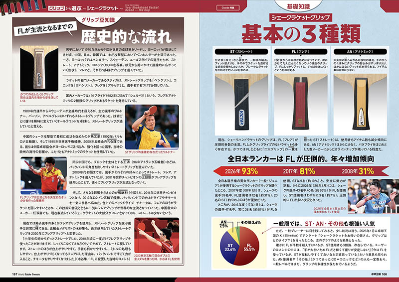 グッズ特集では、「グリップから選ぶシェークラケット」と題し、現在のシェークハンドラケットのグリップのトレンドや歴史的な経緯、トップ選手が語るグリップへのこだわり、メーカーの設計思想や専門店のおすすめポイント、各メーカーのイチオシラケットカタログなど、盛りだくさんの内容となっている。