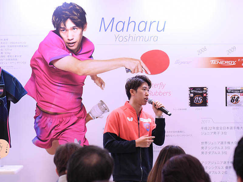 バタフライ契約の吉村真晴選手をゲストに迎えてのトークショーも開催。吉村選手は、バタフライ製品とともに歩んできたキャリアを熱っぽく語った