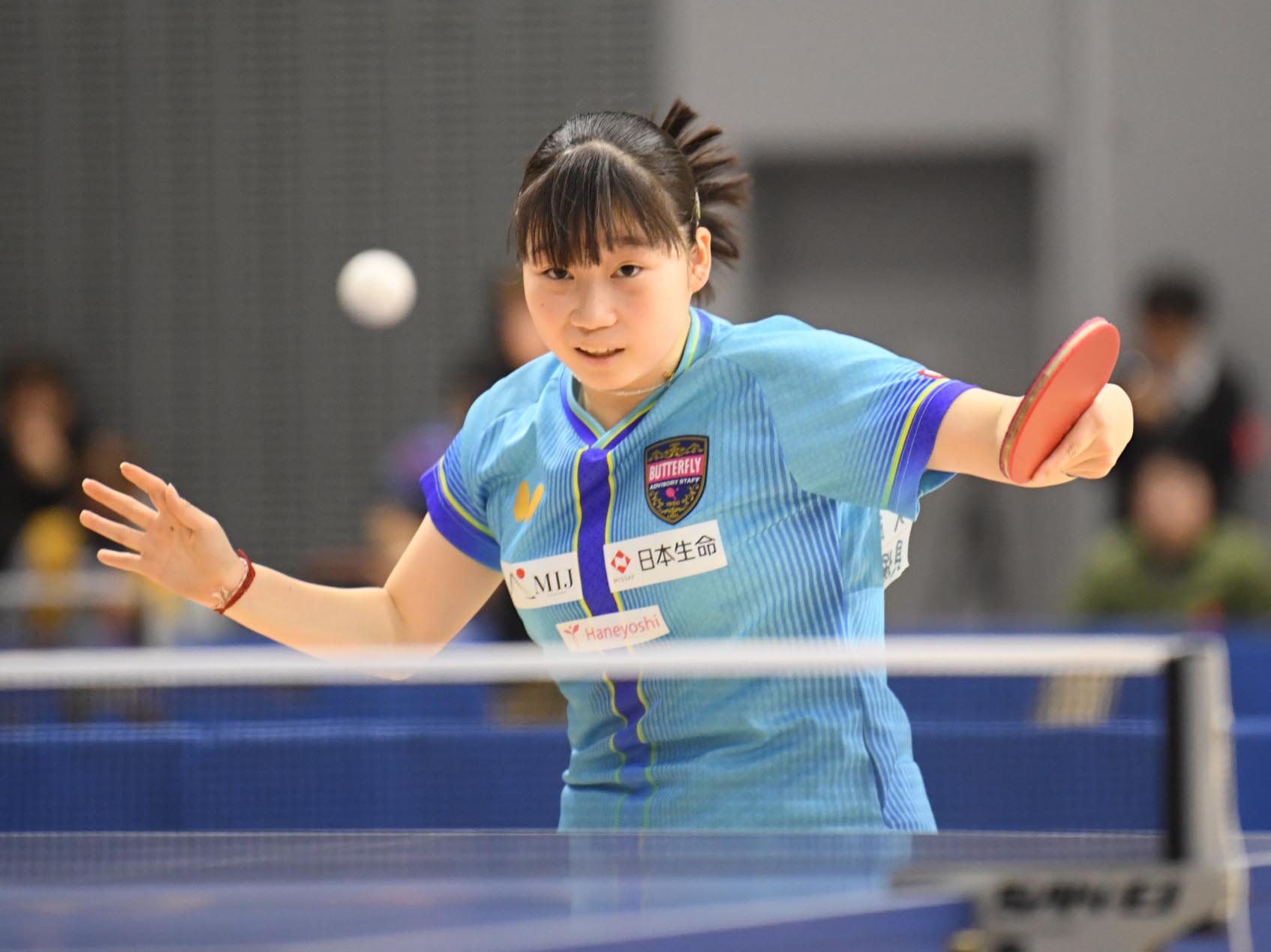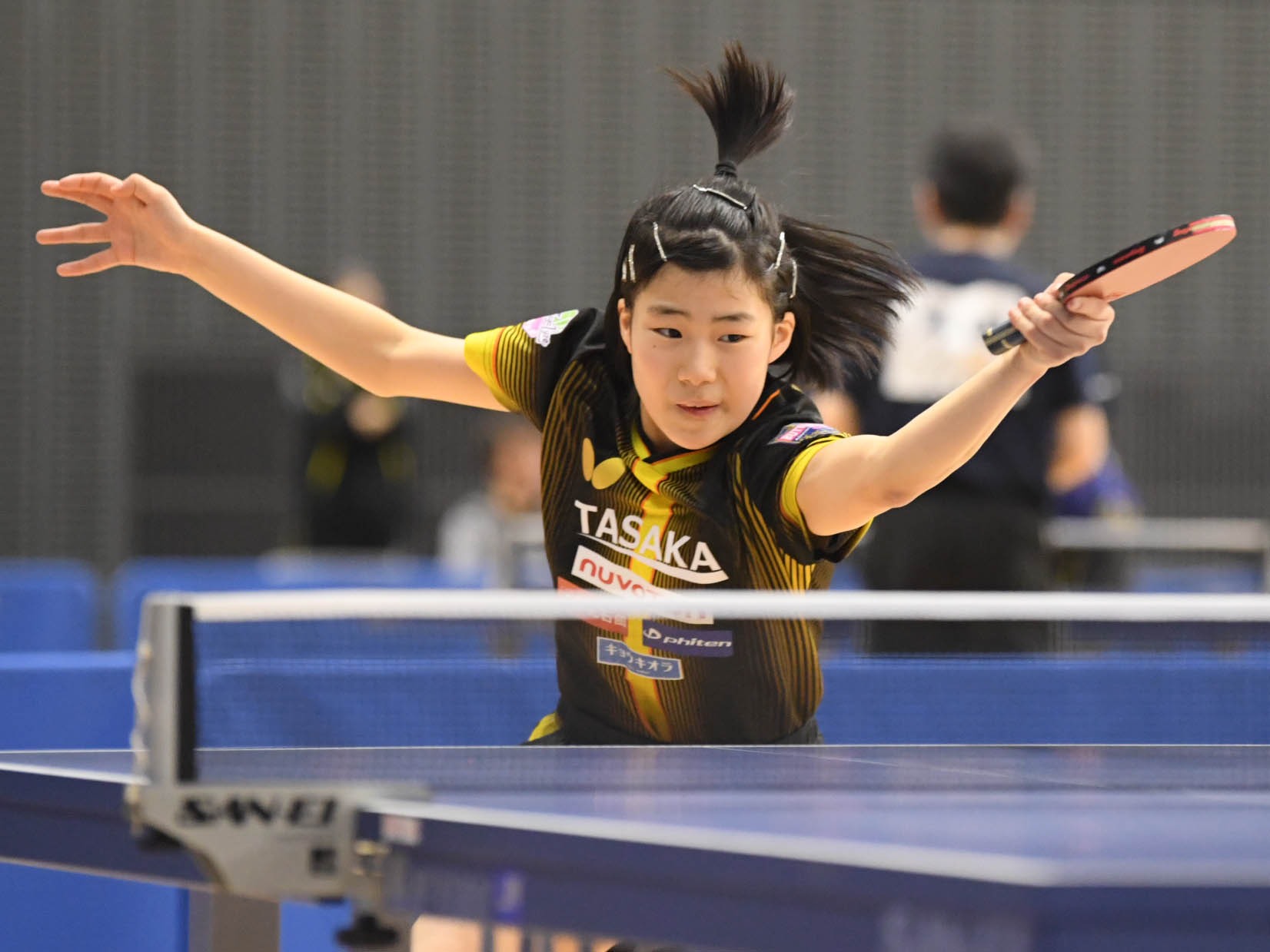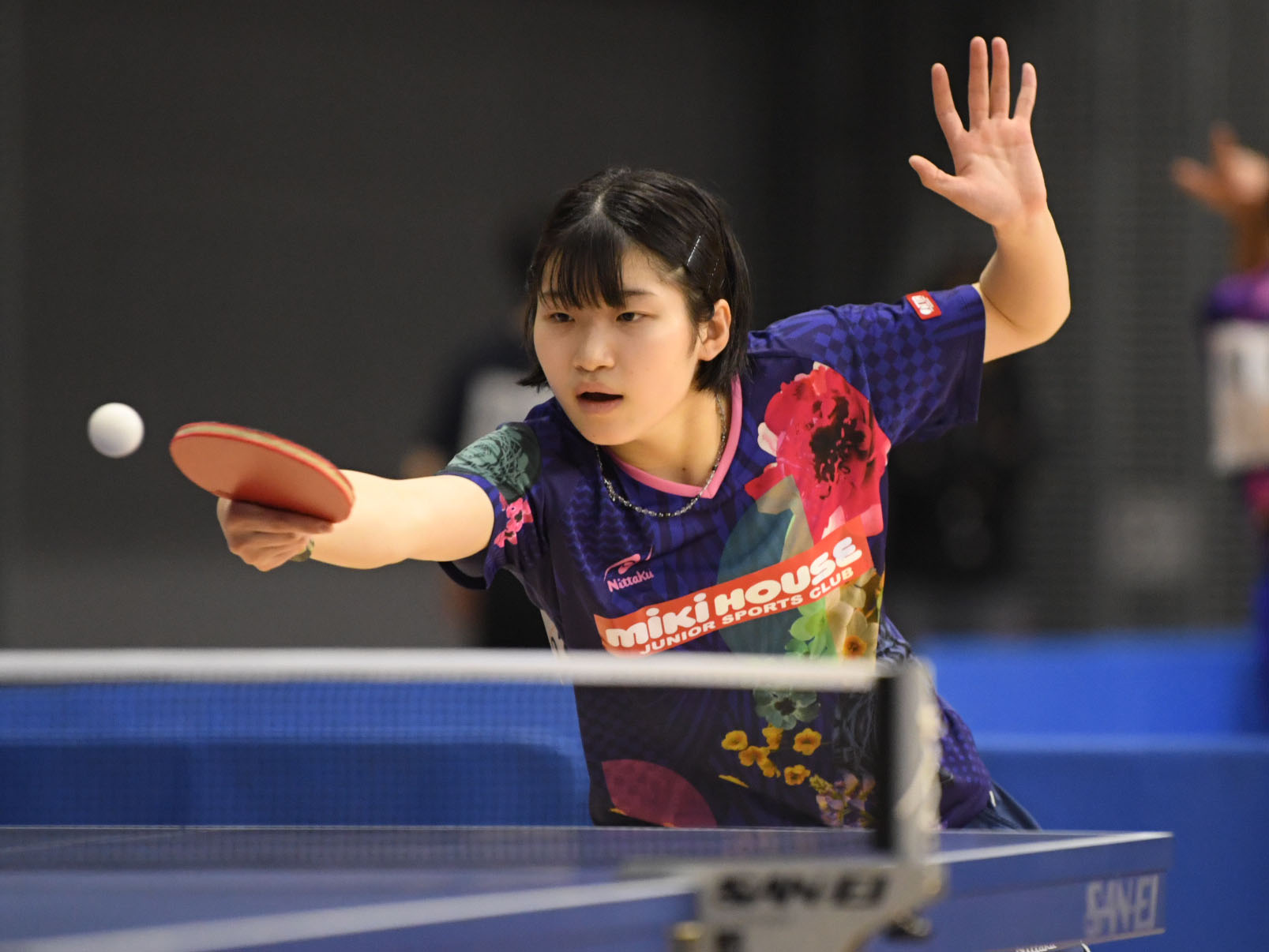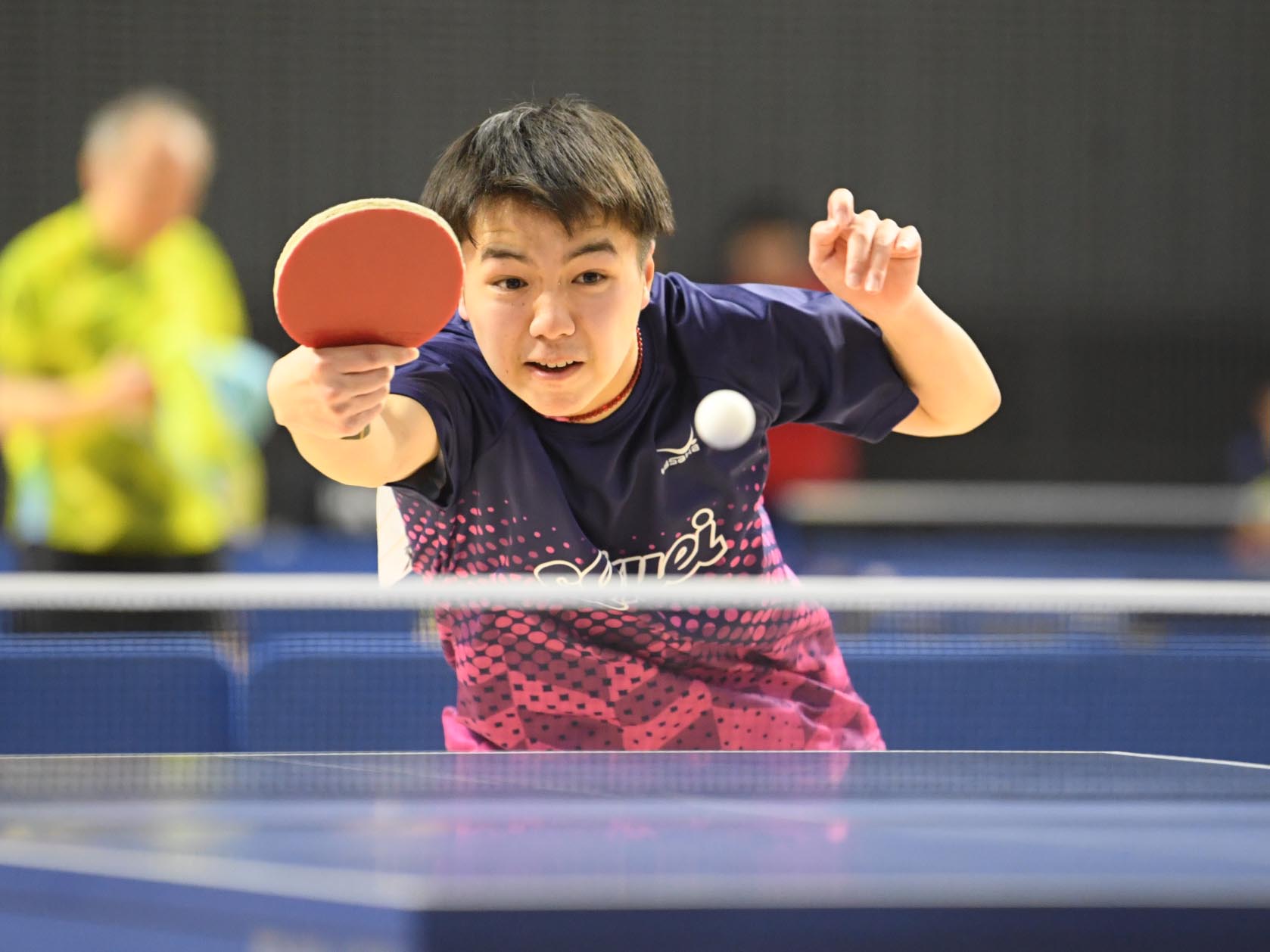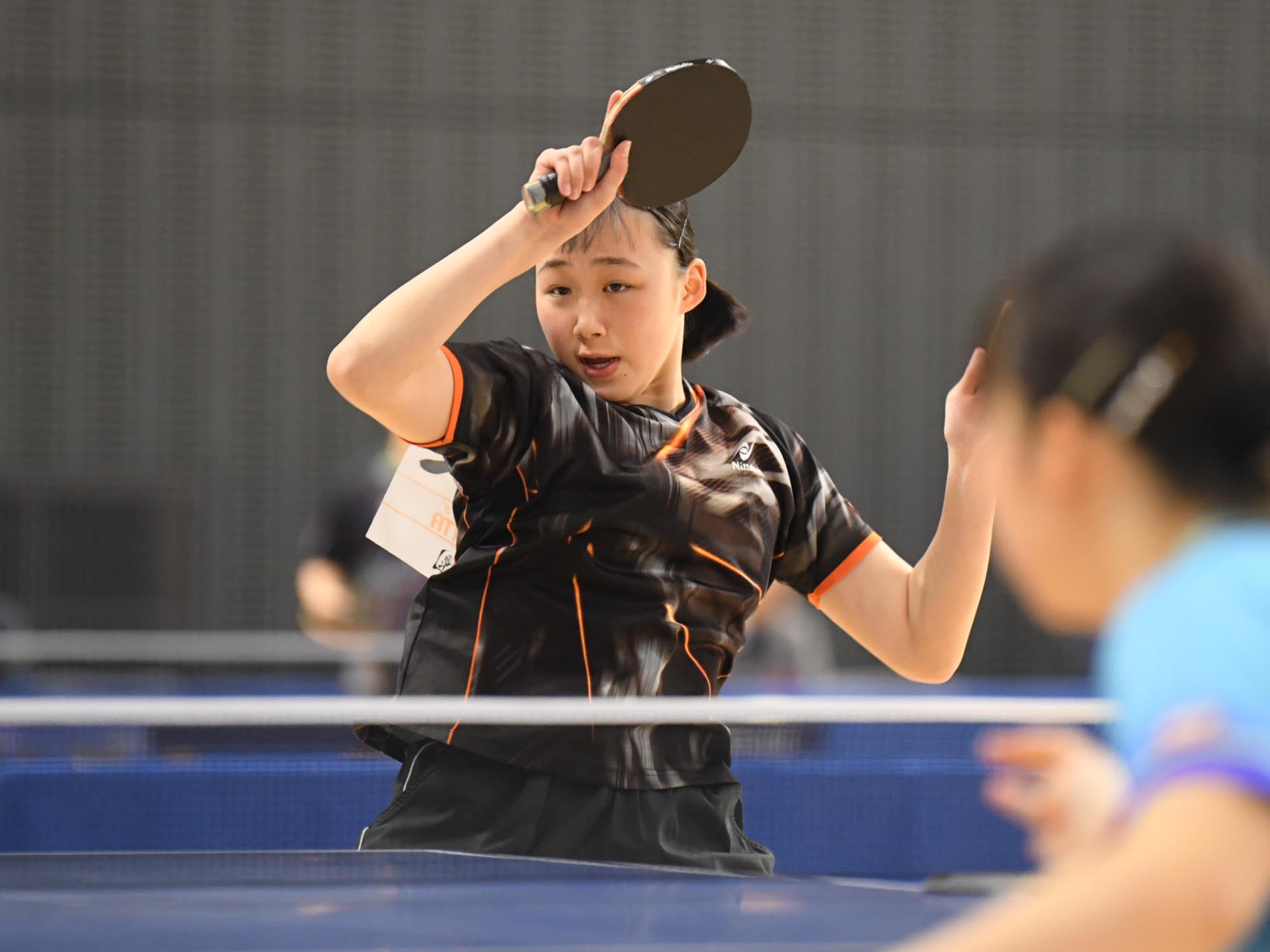 女子ジュニア決勝は中学生対決となり、中学2年の伊藤がフルゲーム11-9で勝利して優勝。威力ある両ハンドドライブで堂々の優勝を果たした。村松も中学1年での決勝進出は見事。準決勝では松島を3-2で下した。