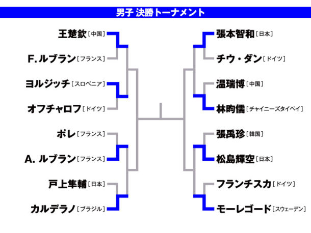 王楚欽(中国)4(11-13, 11-9, 9-11, 11-5, 11-6, 15-13)2 F. ルブラン(フランス)