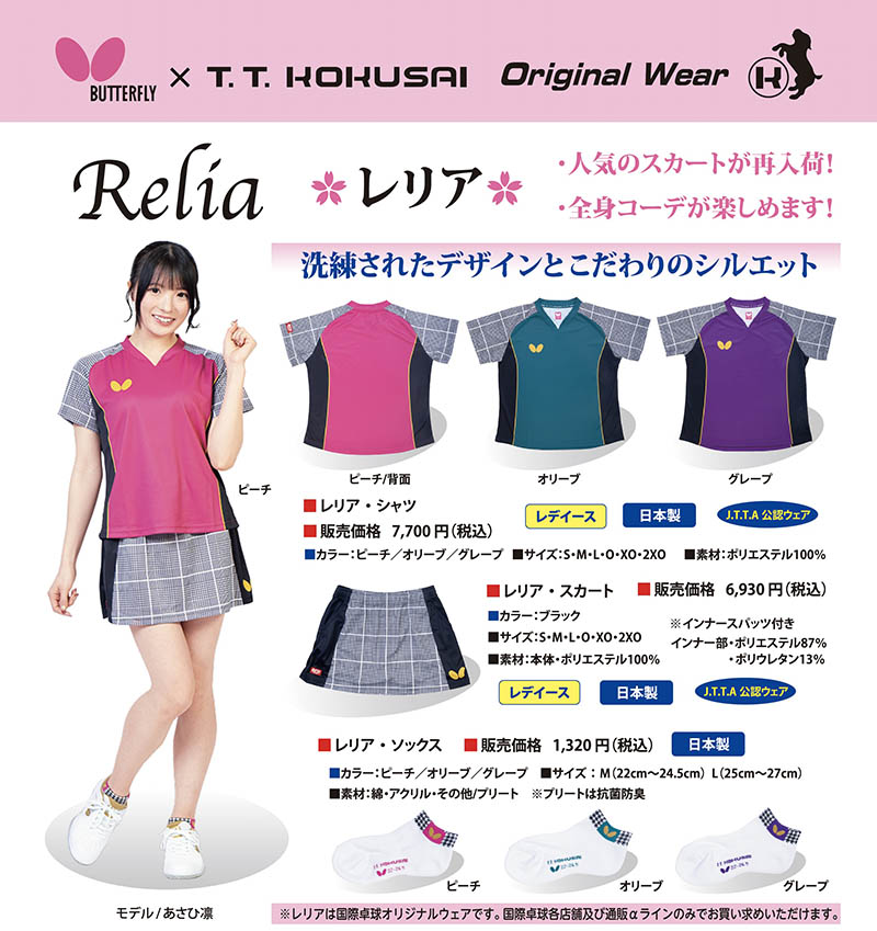 また、しばらく欠品となっていた同店のオリジナルレディースウェア『レリア』(バタフライ製)のスカートが再入荷となり、トップス・ソックスと合わせて好評発売中。おしゃれなウェアを探している女性は、要チェック!