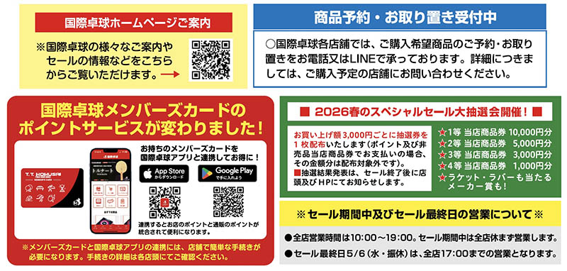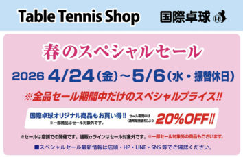 国内最大級の卓球ショップ『国際卓球』の各店舗で、春のスペシャルセールが開催される。期間は2026年4月23日(木)〜5月6日(水・祝)。この期間だけの特別価格で提供されるアイテムがたくさんなので、ぜひ買い物に出かけてみよう。