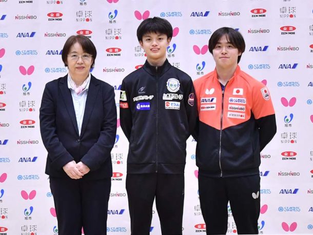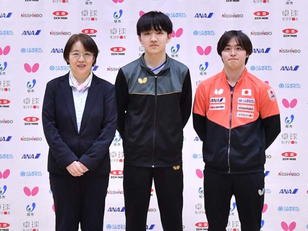 U-18優勝の中野琥珀(中央)。左:馬場美香・強化本部長、右:森薗政崇・男子JNT監督 (写真提供:日本卓球協会)