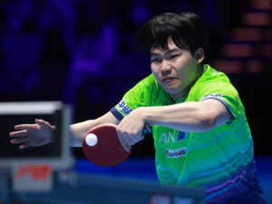 2019年のT2ダイヤモンドの特別ルールで試作段階のピンクのラバーをバック面に貼って登場したスッチ(ルーマニア)。ピンクのウエアとのコーディネートがなんとも可愛い