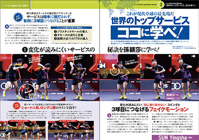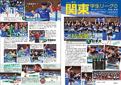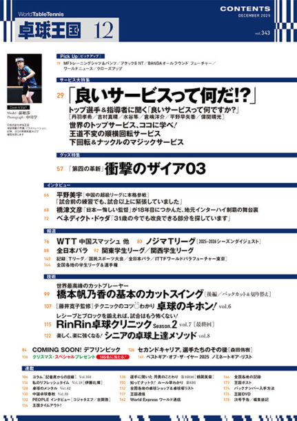 私のリフレッシュタイム〈伊藤礼博(日本大)〉/用具のこだわり〈鶴岡美菜(神戸松蔭大)〉/PEOPLE インタビュー〈コジャタエフ/古関啓〉/中国卓球春秋/コラム「記者席からの目線」/卓球のメンタル/王国タイムアウト!/知ってナットク!ルール早わかり!/王国通信/全国各地の記録/他
