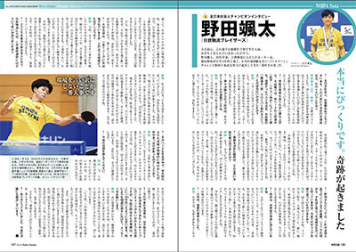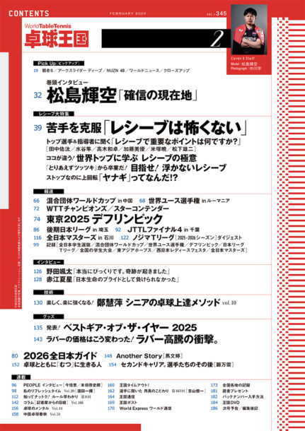 私のリフレッシュタイム〈濵田一輝(早稲田大)〉/用具のこだわり〈吉山僚一(日本大)〉/PEOPLE インタビュー〈今佳恵/本坊啓史朗〉/中国卓球春秋/コラム「記者席からの目線」/卓球のメンタル/王国タイムアウト!/知ってナットク!ルール早わかり!/王国通信/全国各地の記録/他